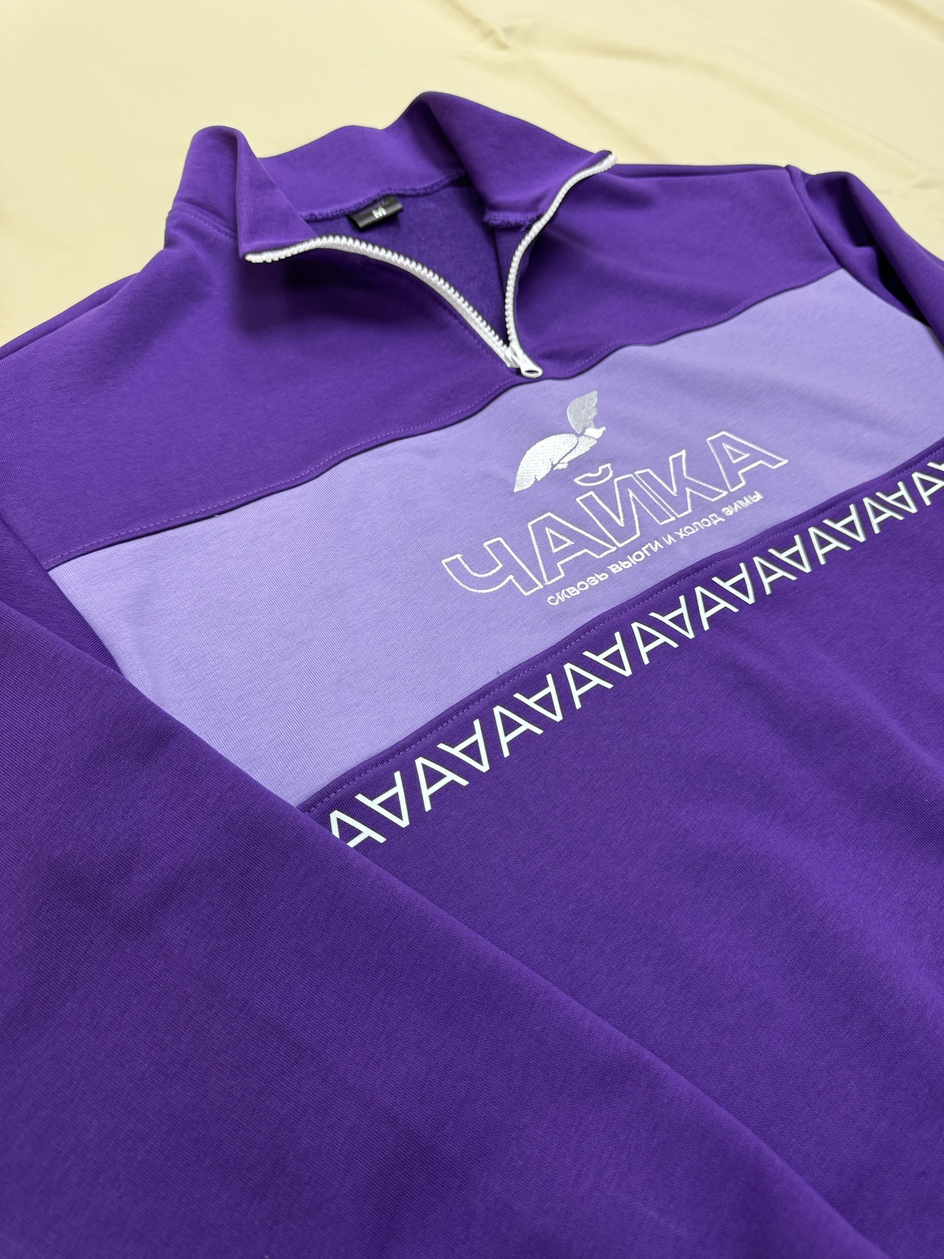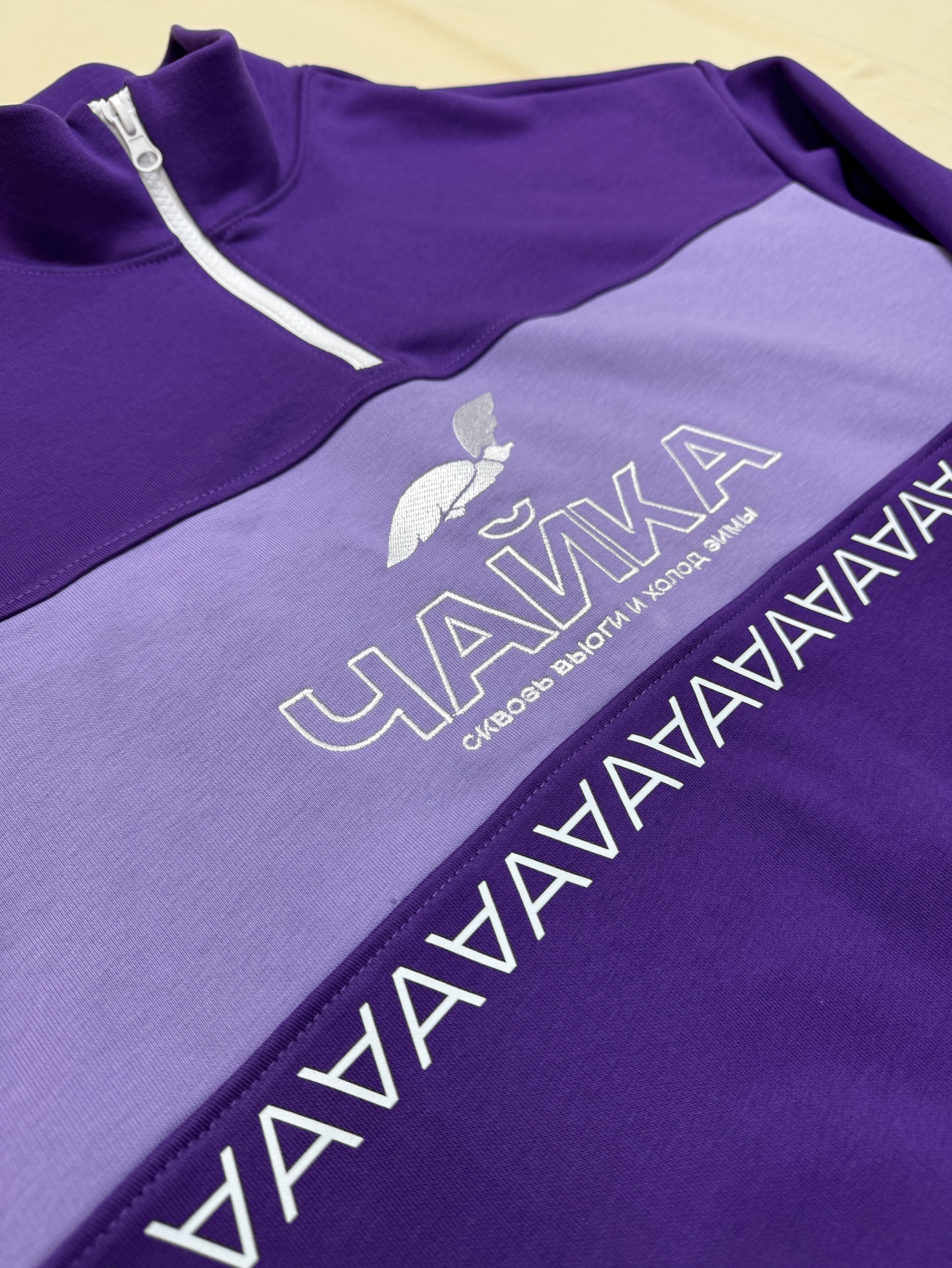 Оригинальный кастомный свитшот с молнией в цвете фиалки с вшитой вставкой цвета милка и вышивкой на груди . Вышивка «Чайка» дополнен слоганом «Сквозь высоту и холод зимы», создавая ассоциацию с преодолением трудностей и свободой полета. Мы шьём не только обычную одежду, но и индивидуальную в различных сочетаниях специально под вас.