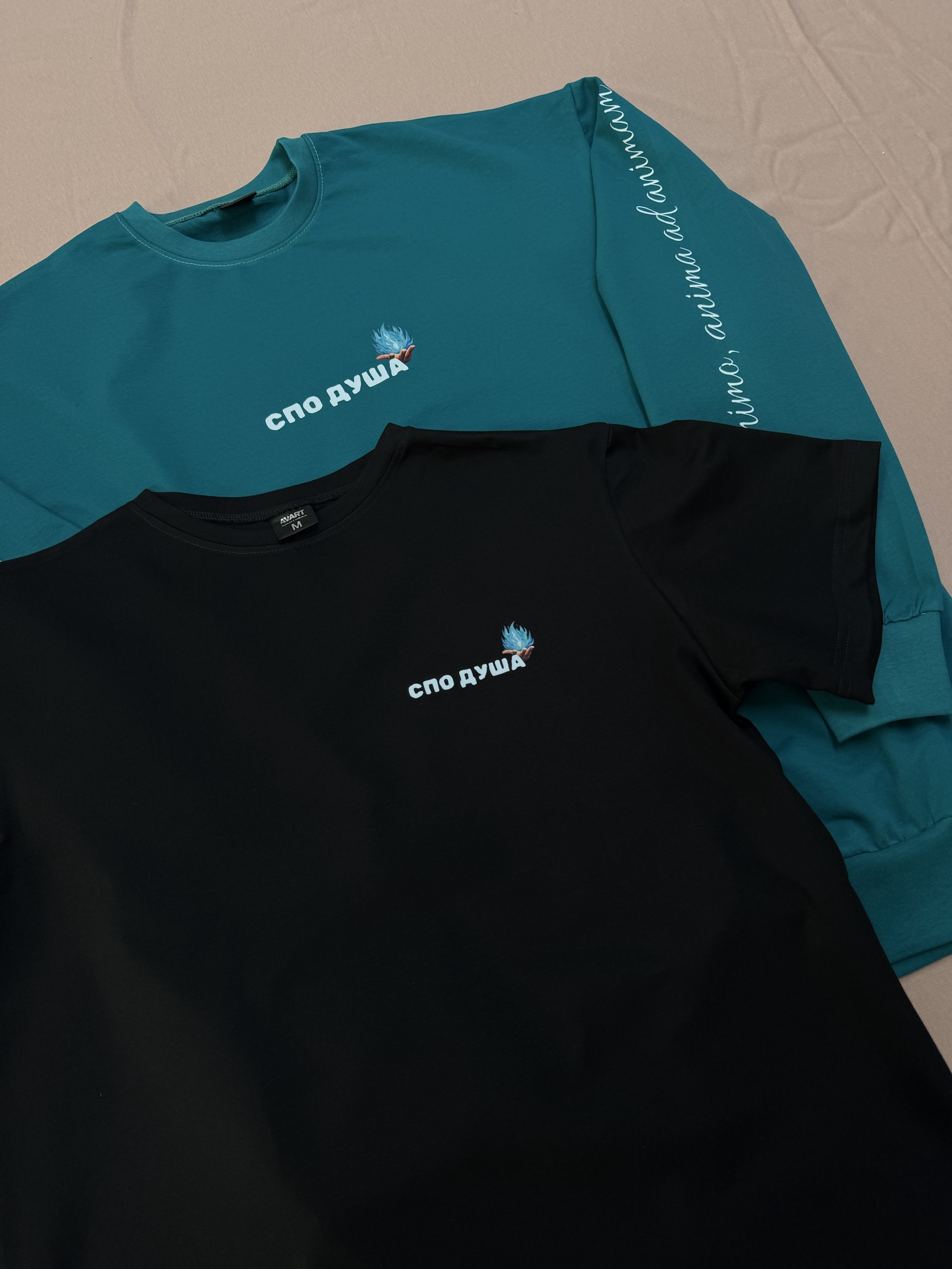 Спереди — аккуратное название «СПО Душа» с огоньком, а по рукавам — фраза на латинском Ab animo, anima ad animam, что переводится как «От души, душа к душе».