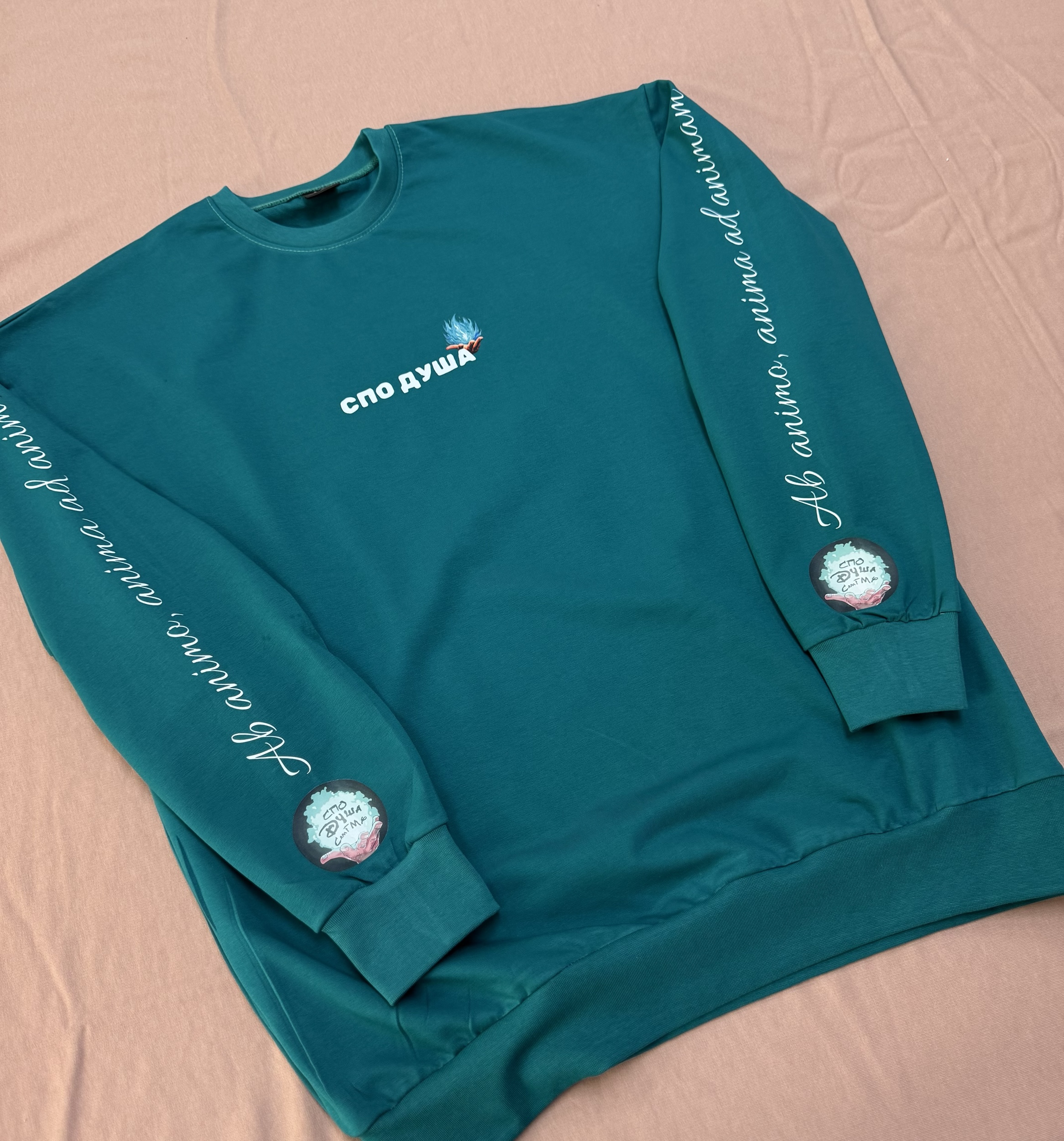 Свитшот изумрудного цвета с надписью «СПО Душа» и яркой спиной