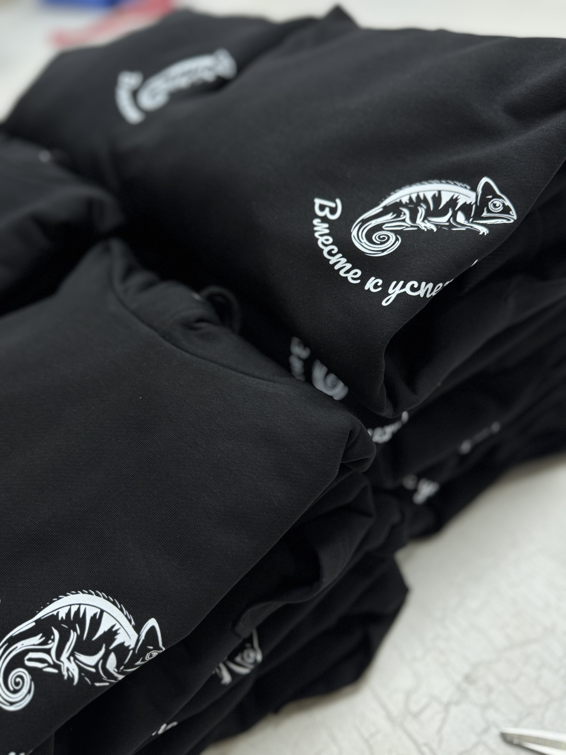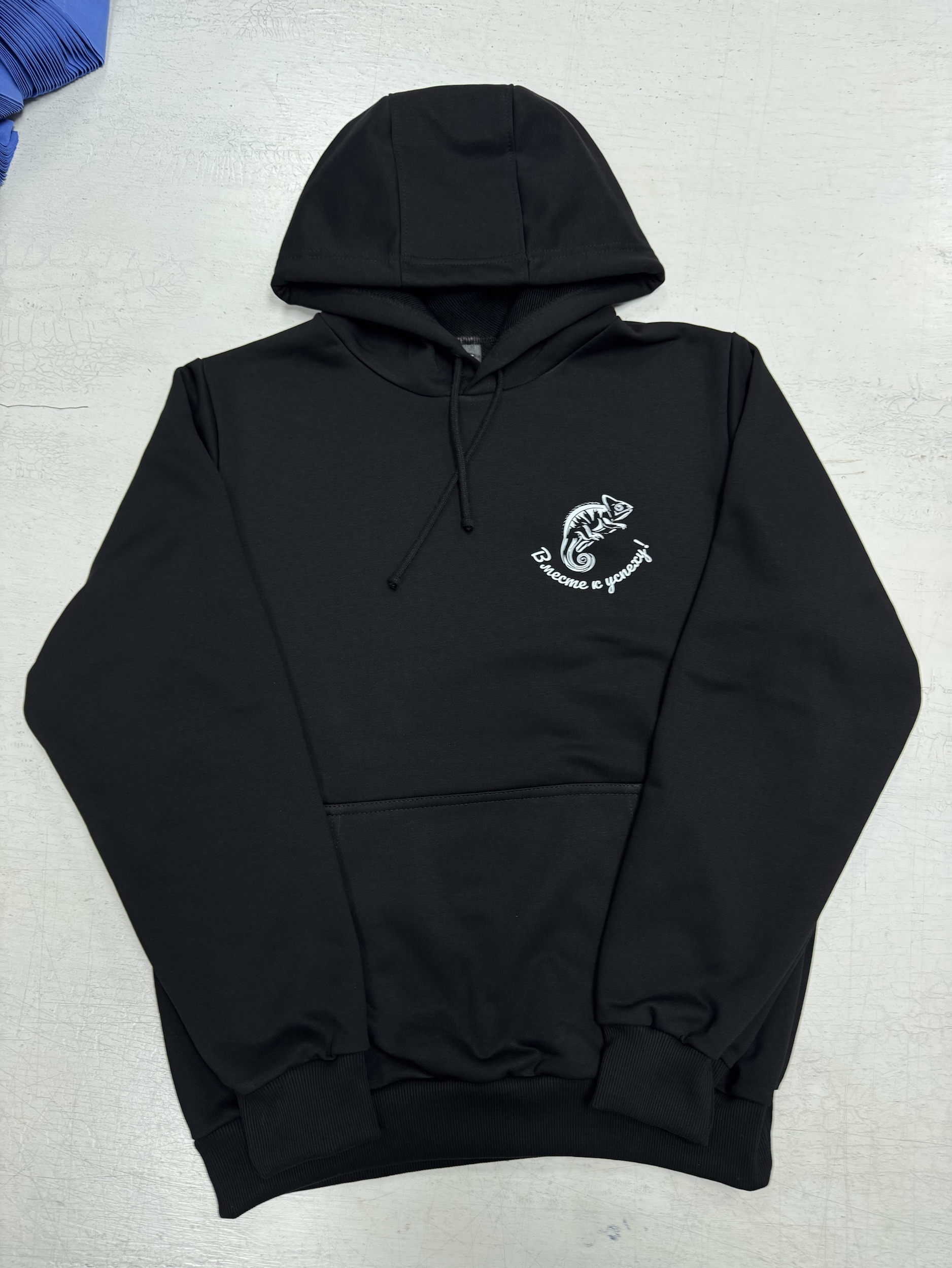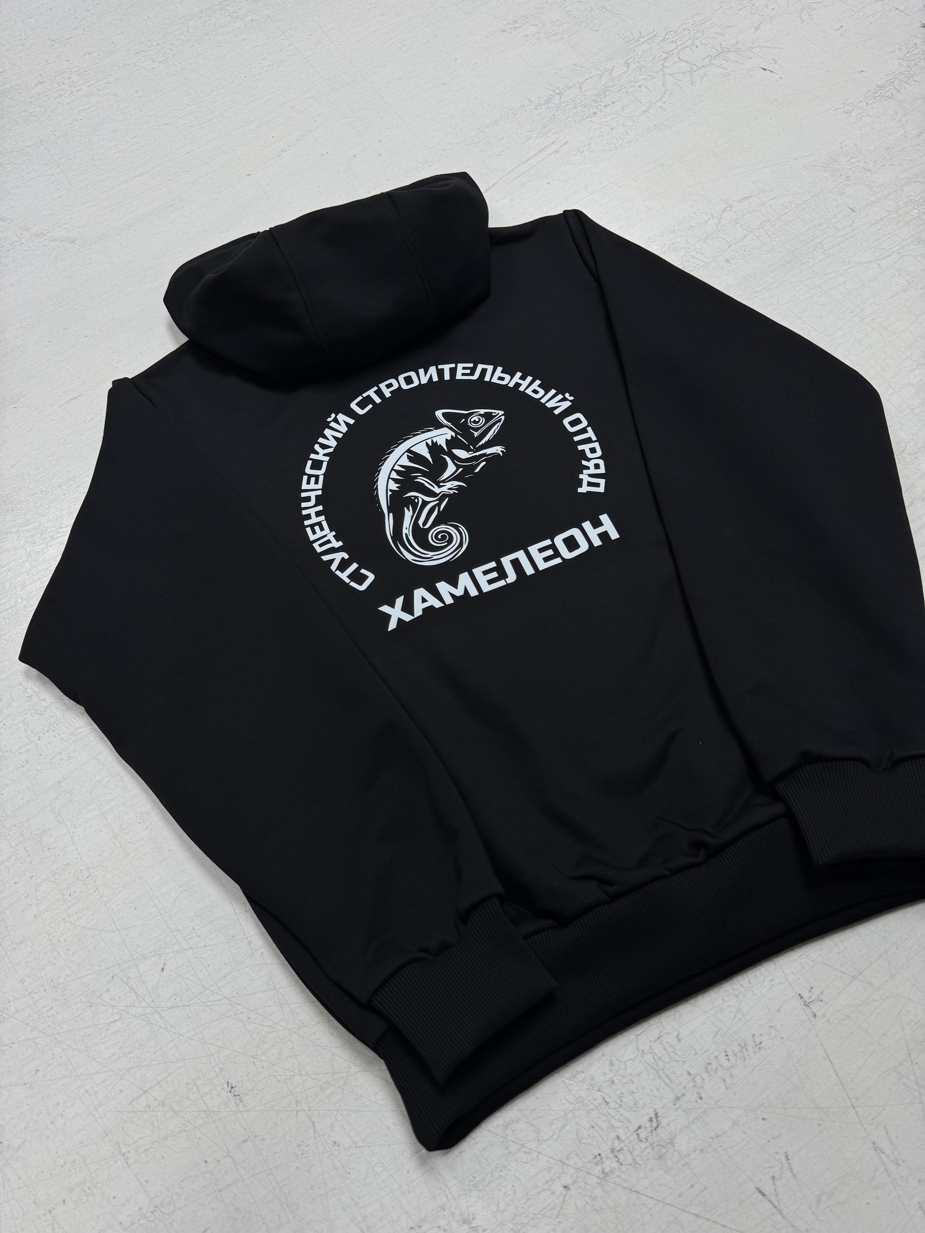 Черное худи с минималистичным принтом на груди и яркой деталью на спине. Спереди изображен стильный силуэт хамелеона с надписью «Вместе к успеху!», подчеркивающей единство и командный дух. На спине — крупный логотип с надписью «Студенческий строительный отряд Хамелеон», выполненный в лаконичном дизайне. Мягкая ткань и удобный крой делают это худи идеальным для повседневной носки или мероприятий отряда.