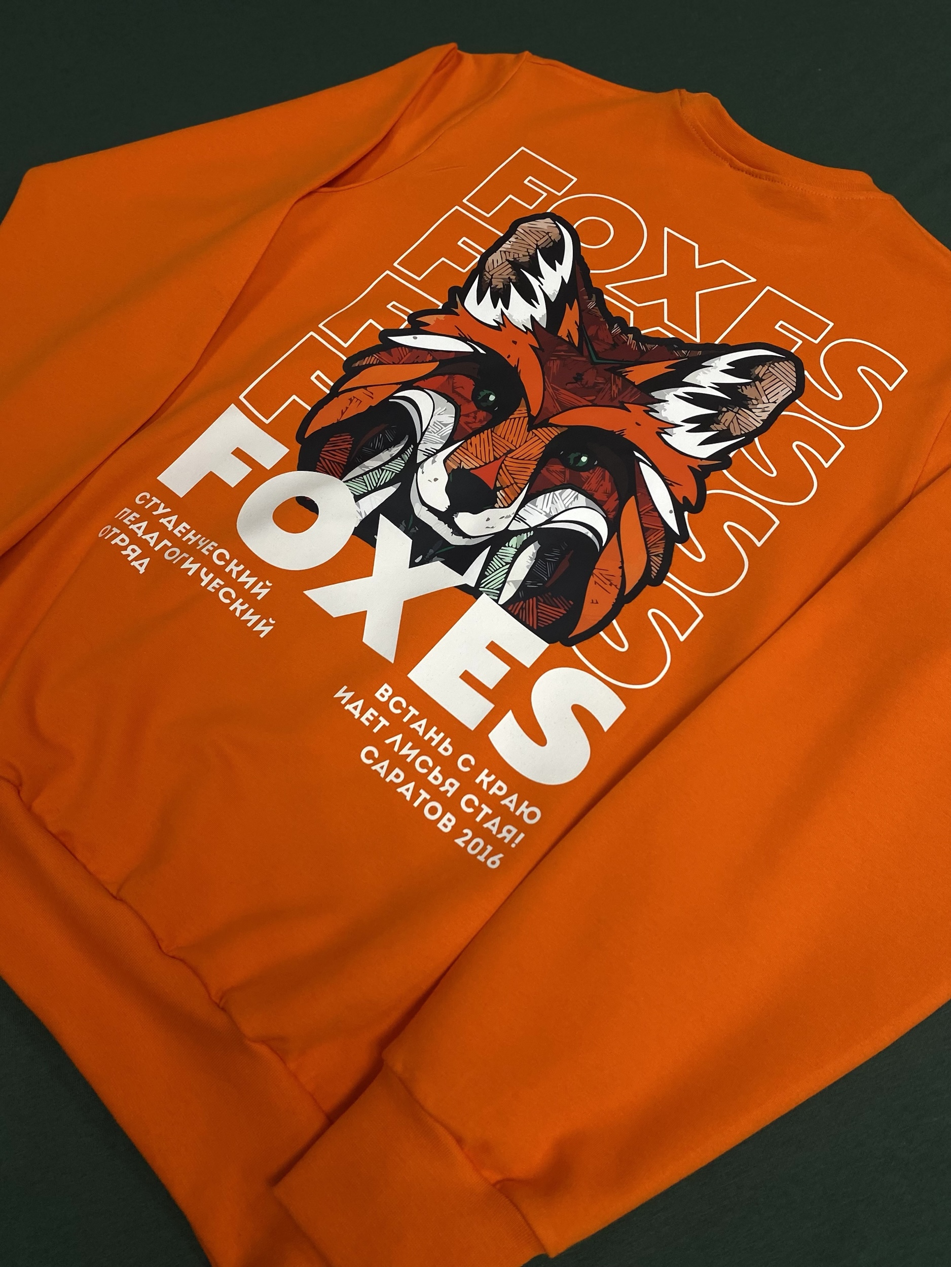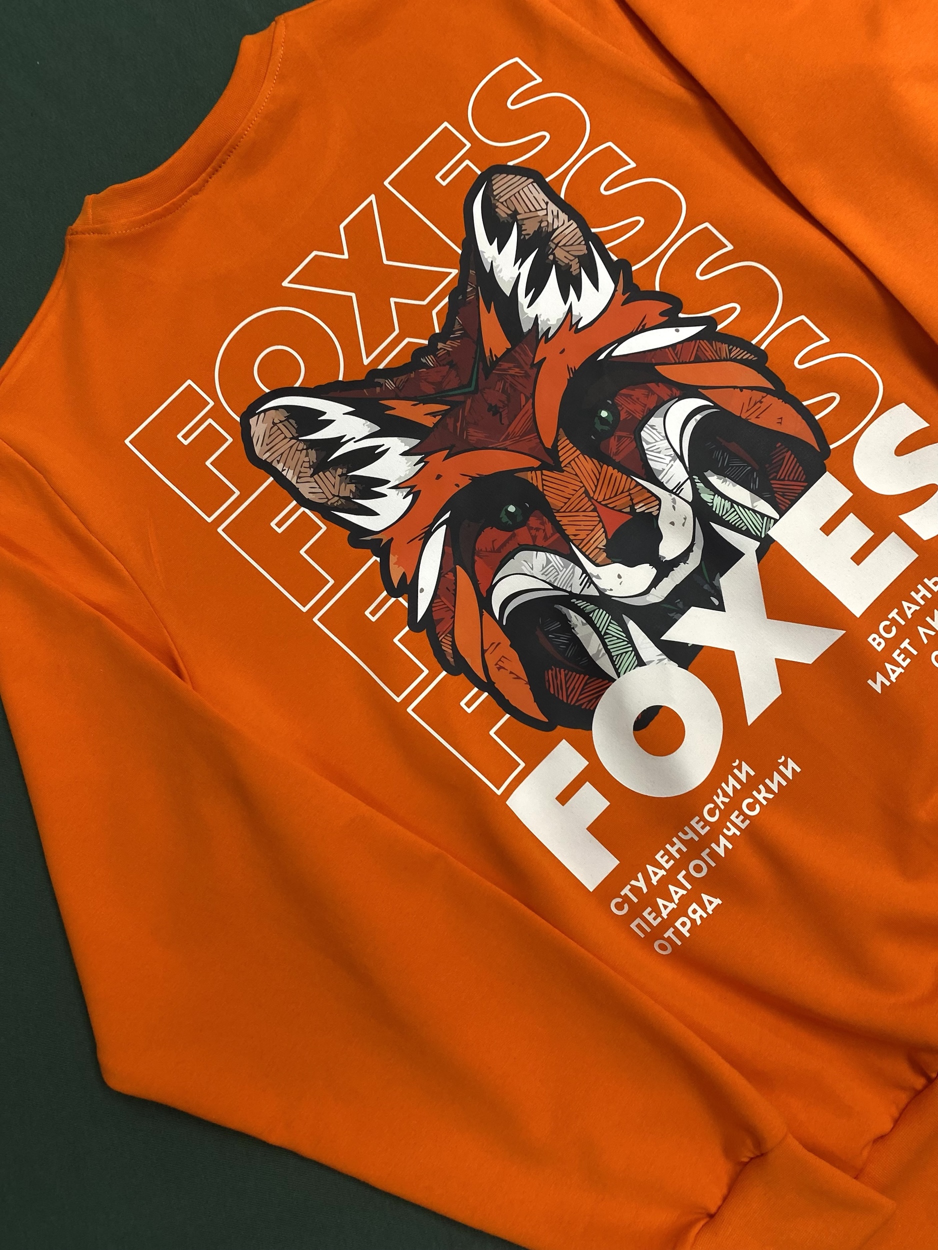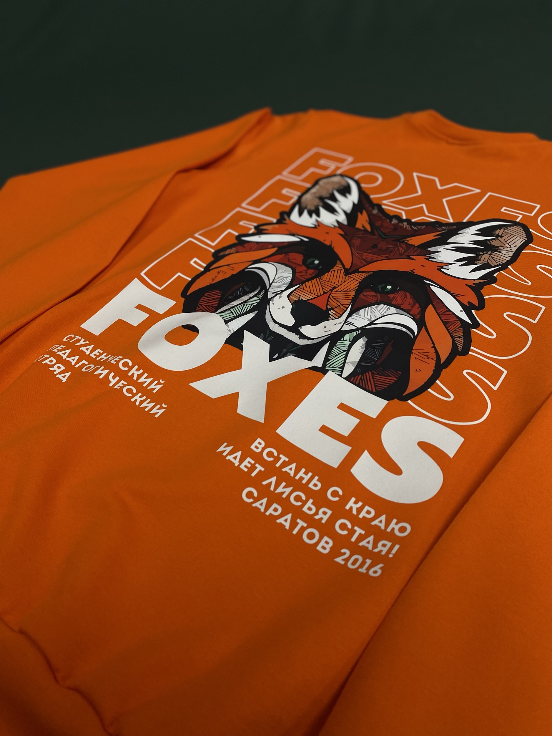 Свитшот цвета «Апельсин» и черная Футболка с минималистичным принтом — часть мерча студенческого педагогического отряда «Foxes». Основной элемент дизайна — яркая стилизованная лиса, выполненная в графическом стиле с элементами текстуры. Контрастные надписи «Foxes» и слоган «Встань с краю, идет лисья стая!» подчеркивают командный дух и энергетику отряда. Черная футболка дополнена небольшим логотипом на груди, создавая гармоничный комплект на зависть студотрядам.