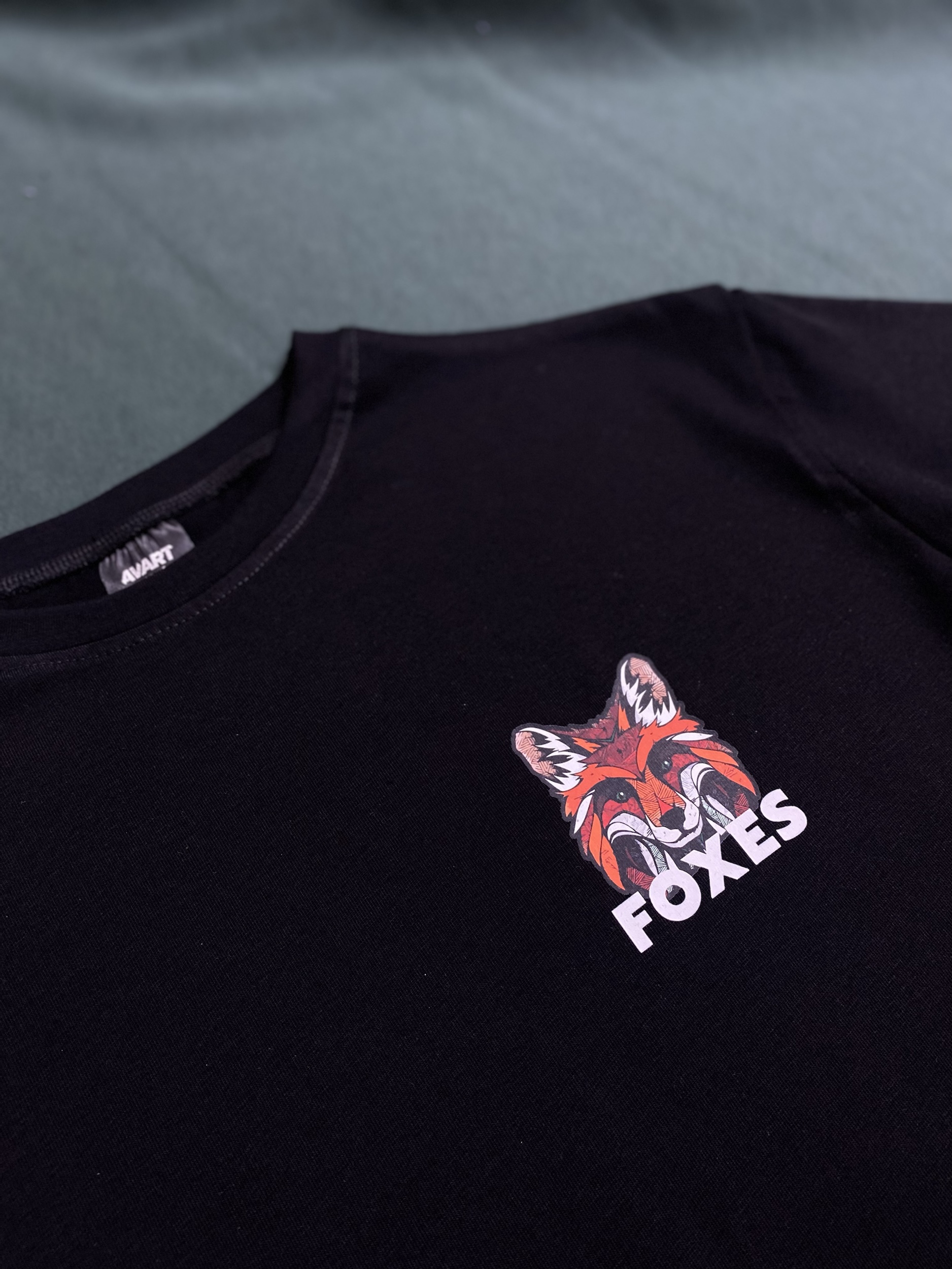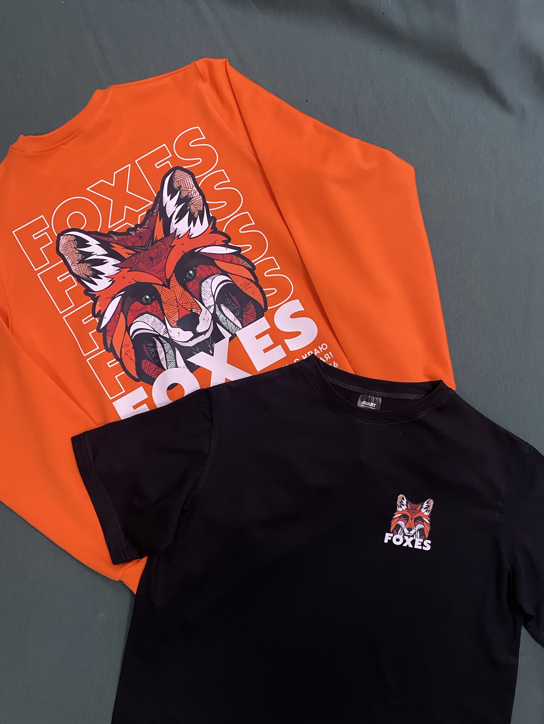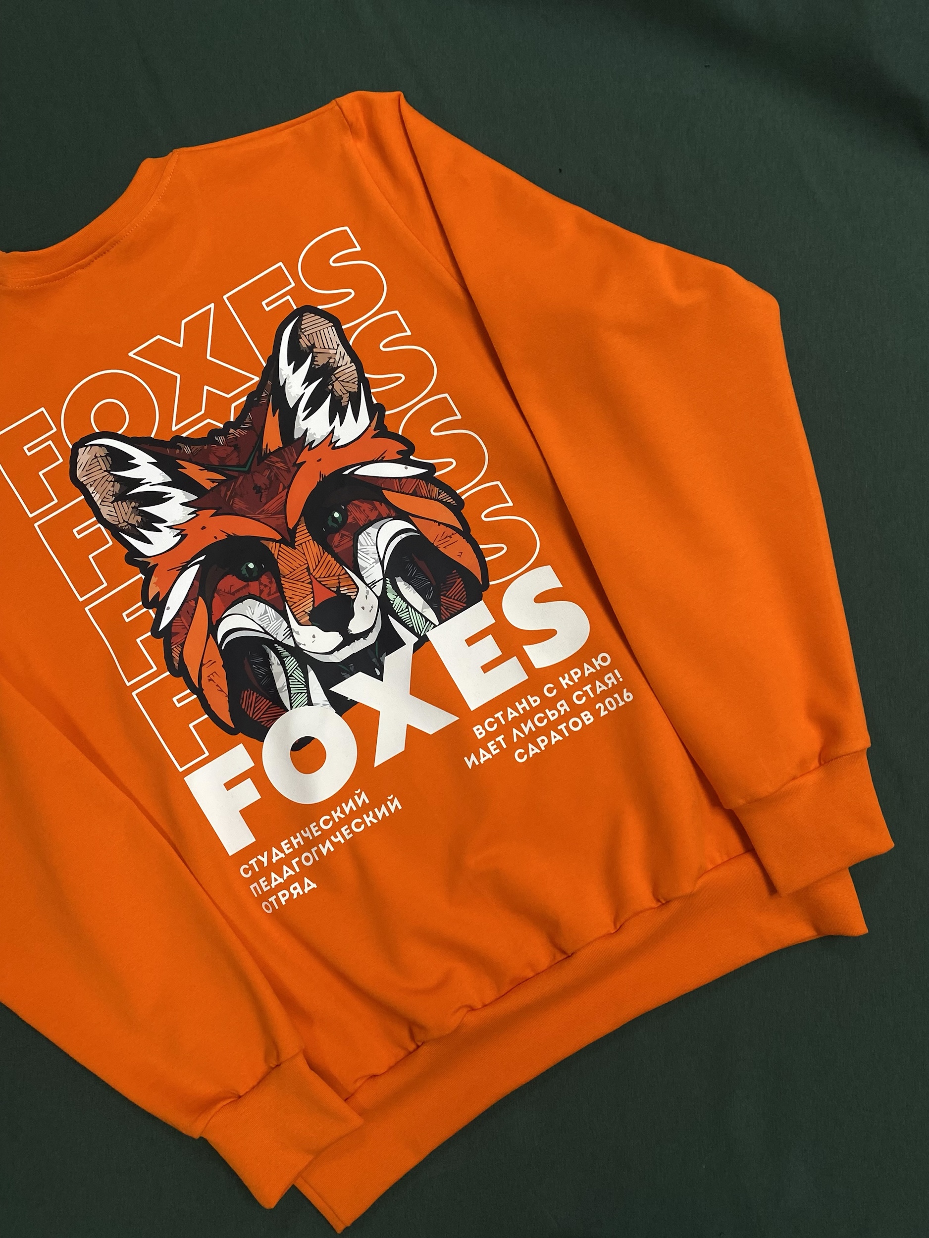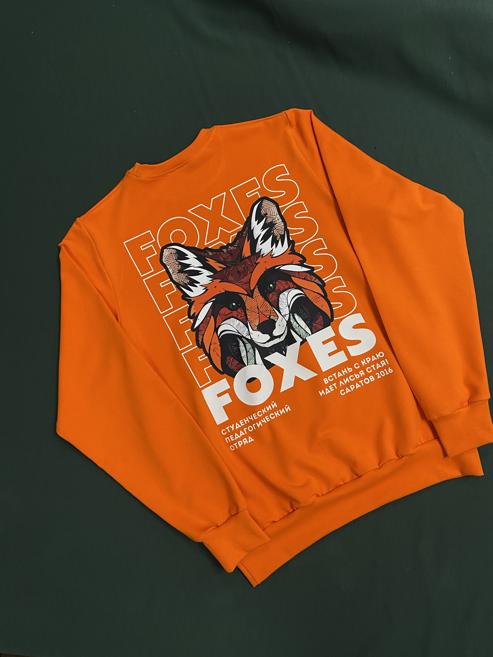 Свитшот цвета «Апельсин» и черная Футболка с минималистичным принтом — часть мерча студенческого педагогического отряда «Foxes». Основной элемент дизайна — яркая стилизованная лиса, выполненная в графическом стиле с элементами текстуры. Контрастные надписи «Foxes» и слоган «Встань с краю, идет лисья стая!» подчеркивают командный дух и энергетику отряда. Черная футболка дополнена небольшим логотипом на груди, создавая гармоничный комплект на зависть студотрядам.