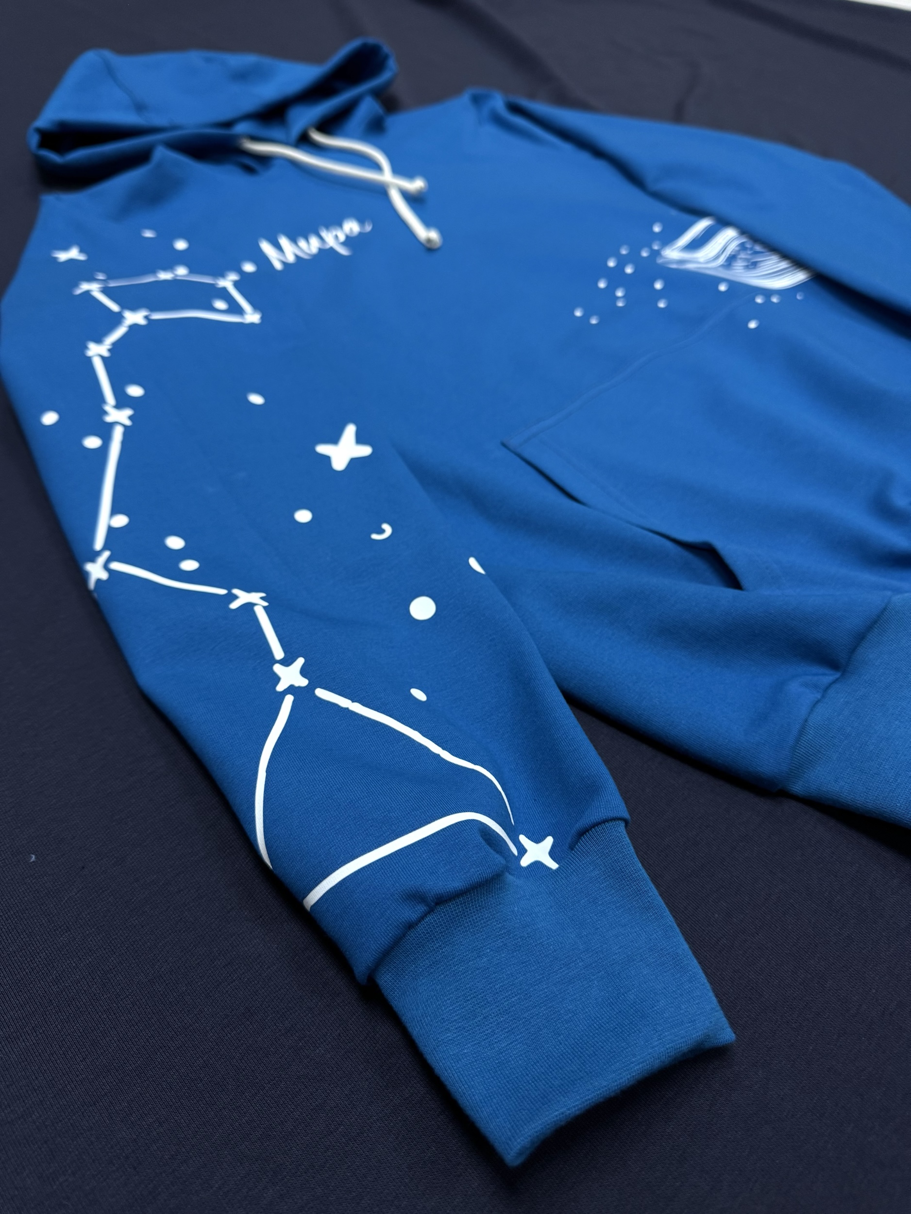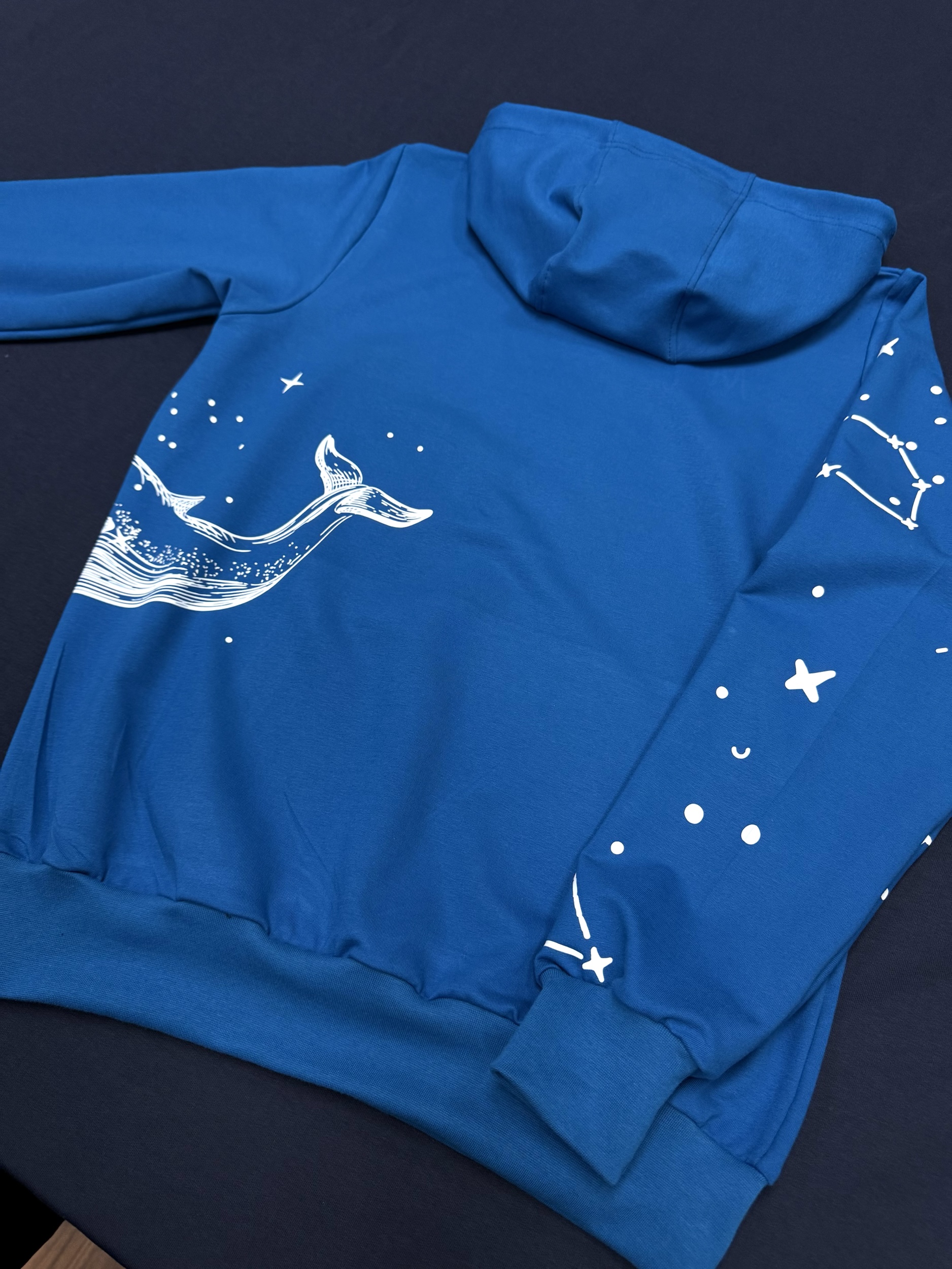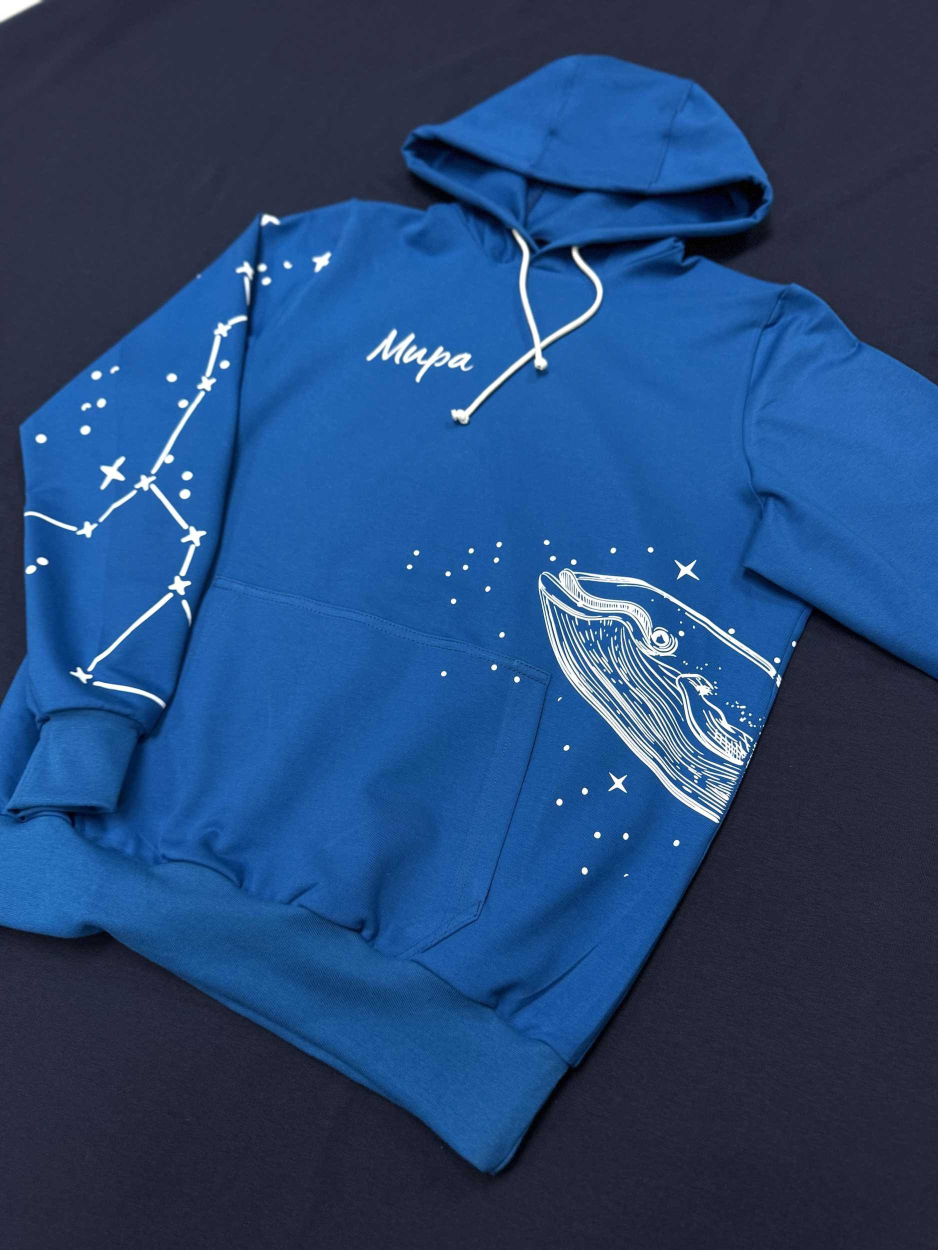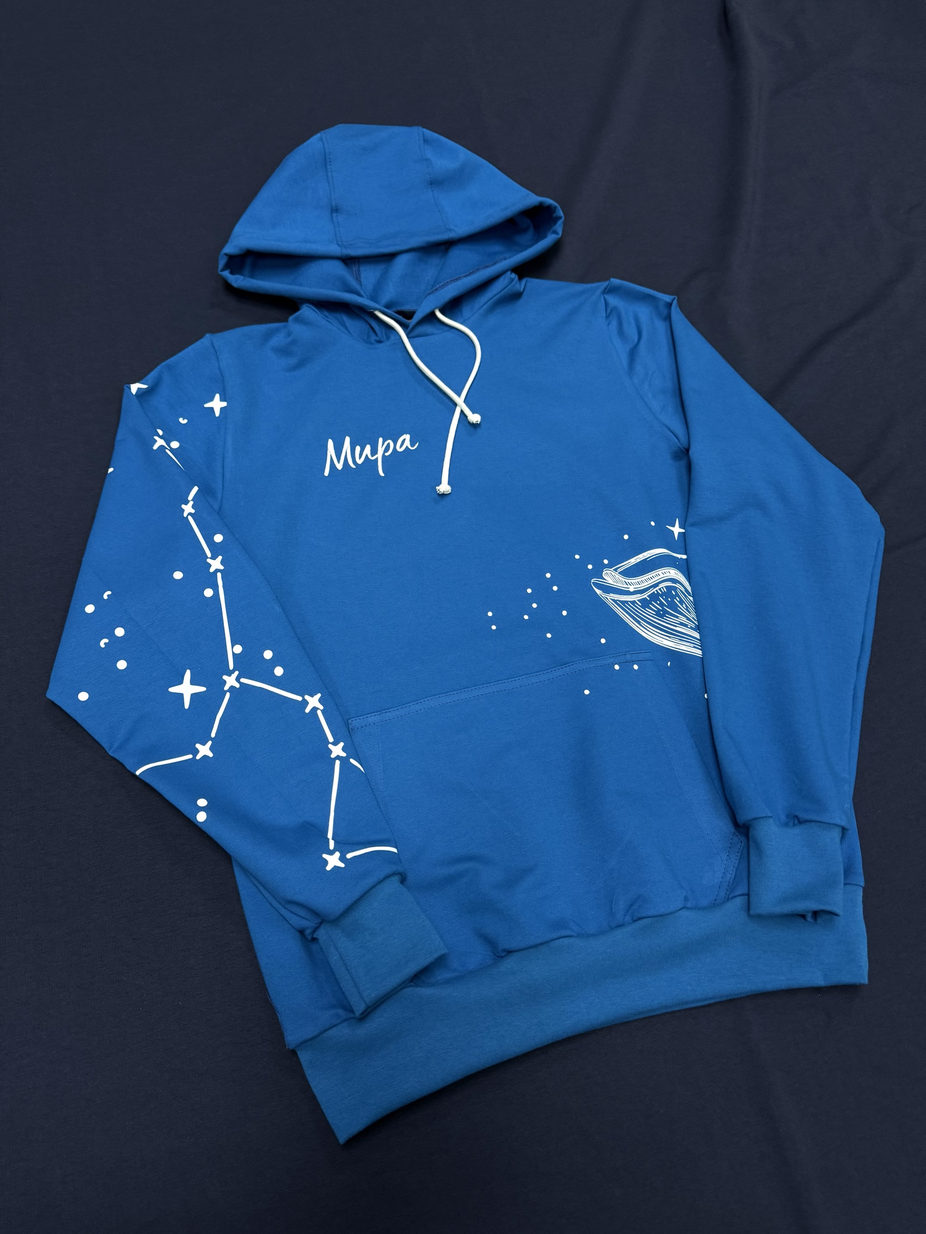 Худи цвета «Санторини» с вышивкой и китом. Глубокий синий оттенок подчёркивает космическую тематику дизайна: на груди — аккуратная вышивка «Мира», а на рукавах и спине — белые принты в виде созвездий и огромного кита, словно плывущего сквозь звёзды. Этот дизайн передаёт атмосферу бескрайнего неба и спокойствия океана, символизируя гармонию, мечтательность и свободу.