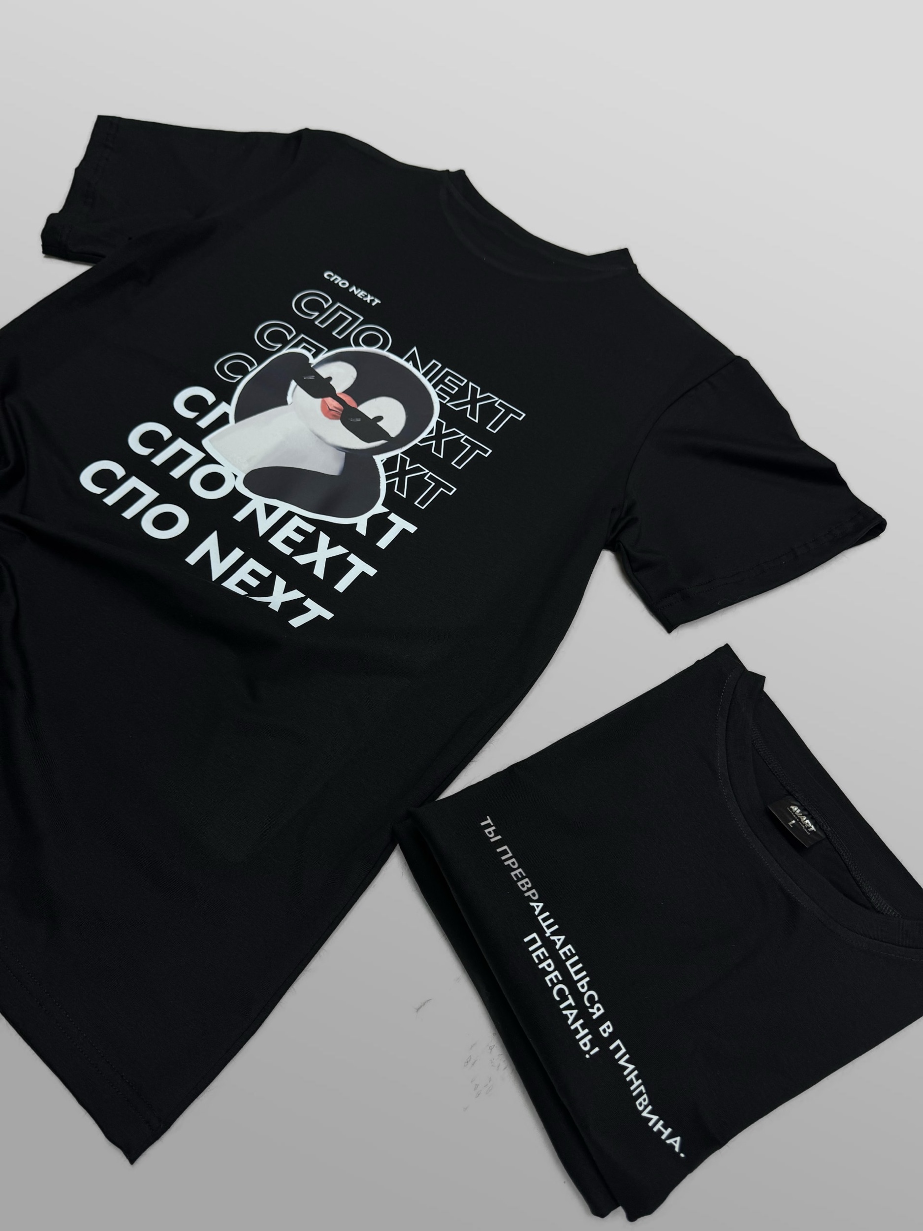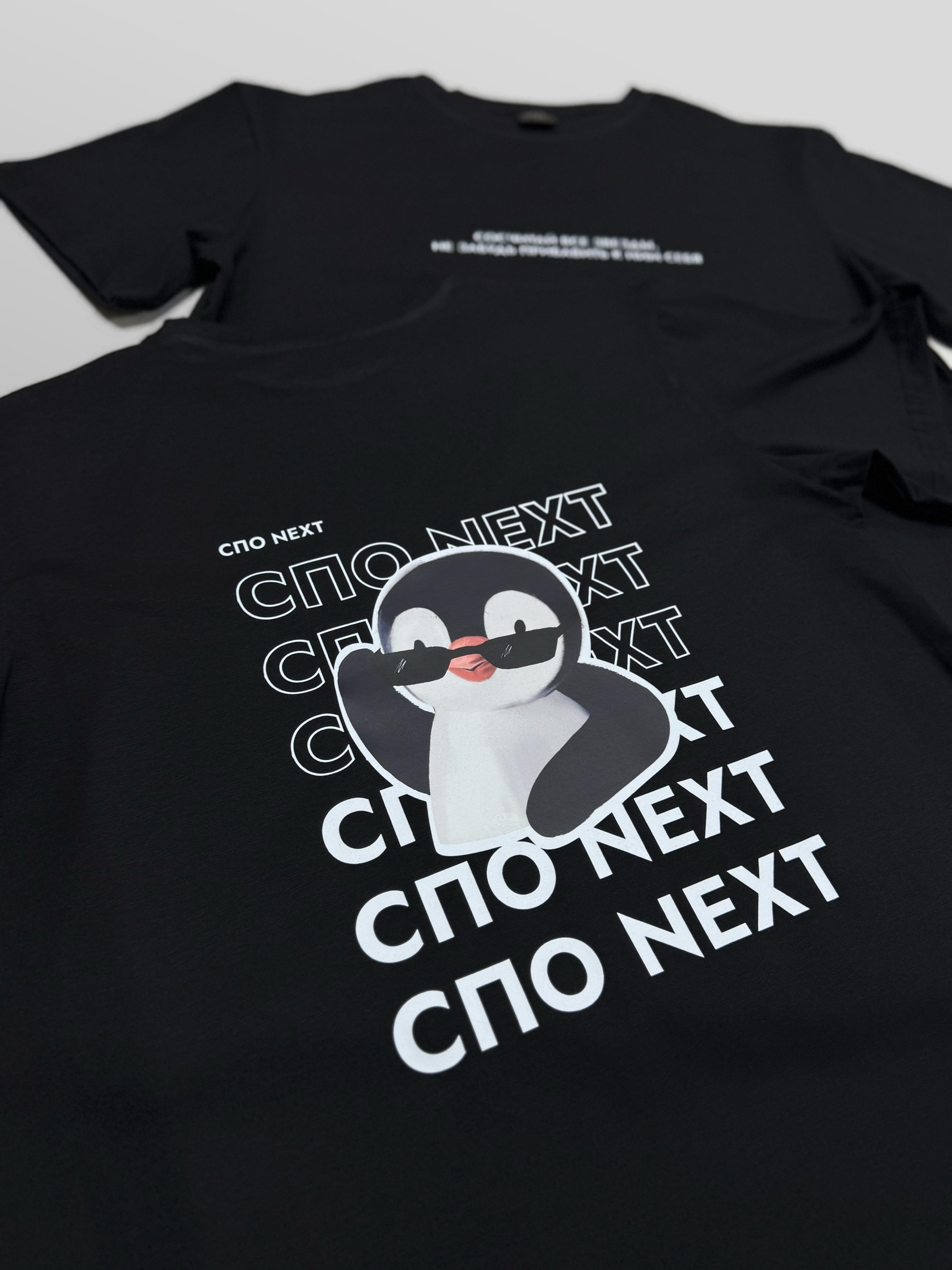 Чёрная футболка, чёткий принт и харизматичный пингвин – футболка, которая сразу привлекает внимание. Лаконичный дизайн дополнен повторяющимся текстом «СПО NEXT». Но настоящая изюминка – это передняя сторона: фраза «Сосчитай все звёзды, не забудь прибавить к ним себя» напоминает о том, что каждый достоин сиять. Другие версии футболки несут в себе не менее яркие высказывания. Стиль, удобство и капля юмора – то, что делает эту коллекцию особенной.