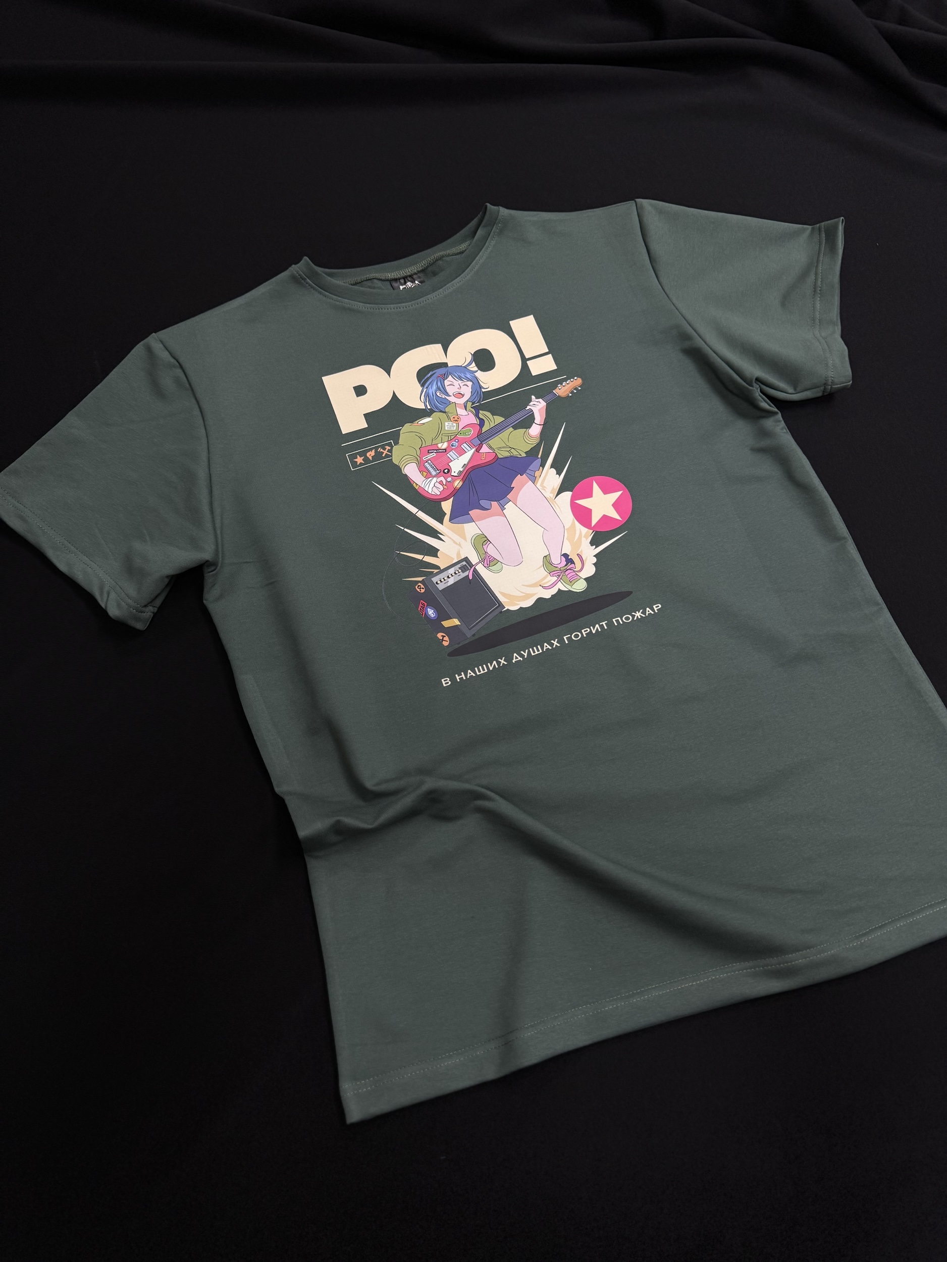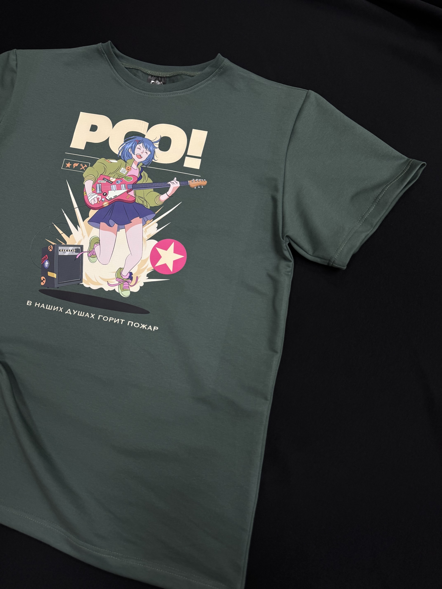 Мерч для rsostyle.ru в цвете «Пихта» с крупным принтом в центре. На рисунке изображена девушка с голубыми волосами, играющая на электрогитаре. Она одета в бойцовку и синюю юбку, а её поза динамичная — будто она прыгает под звуки своей музыки.
