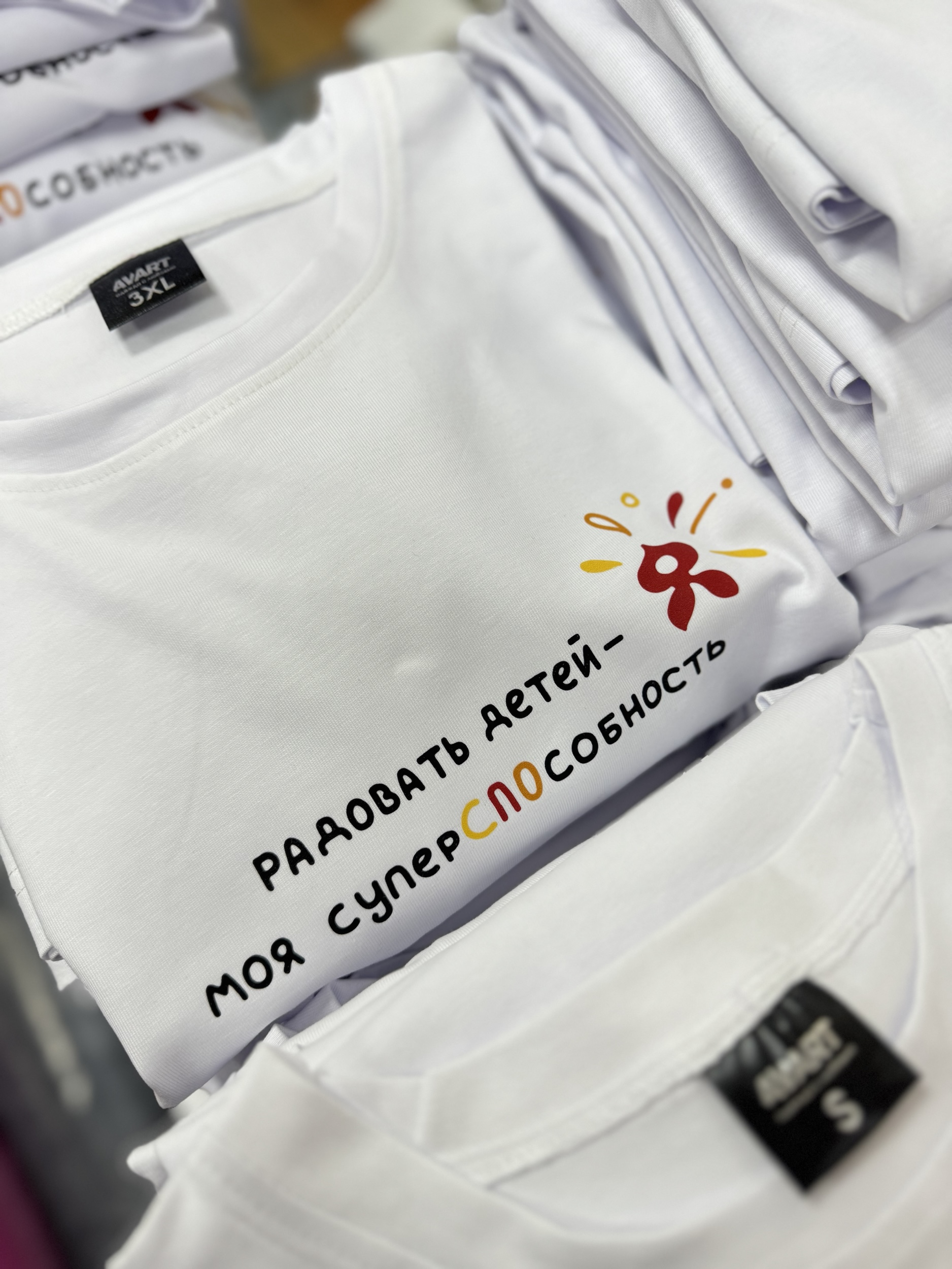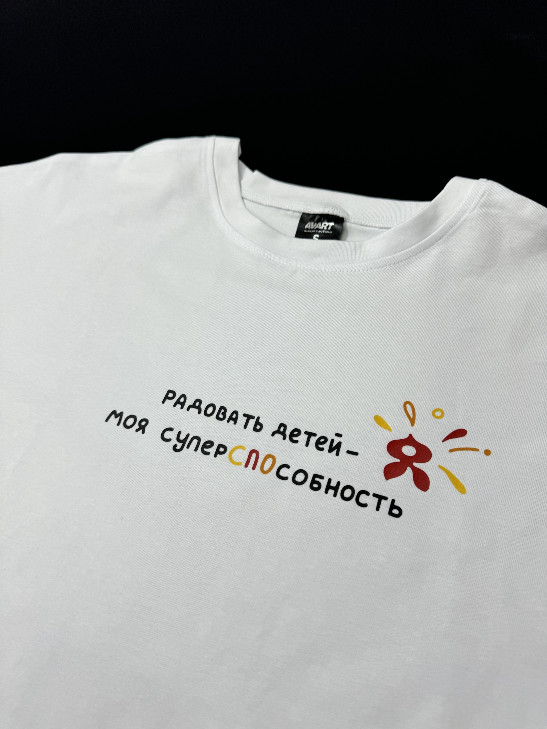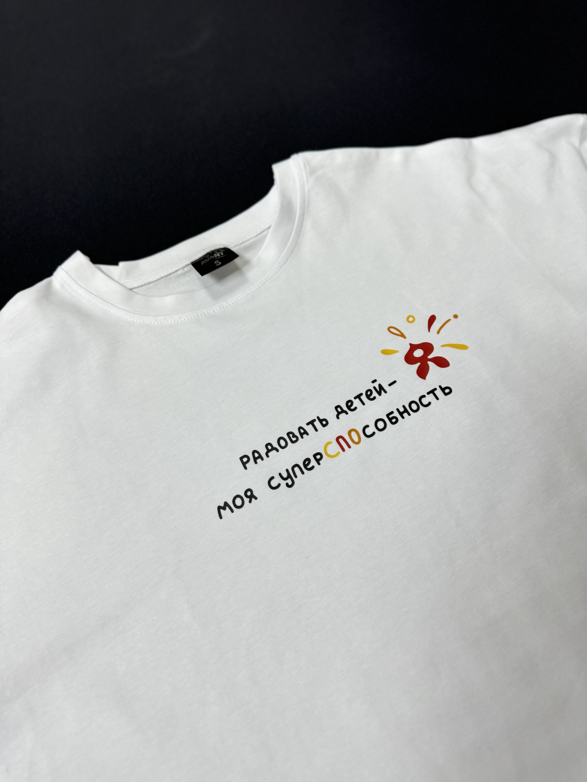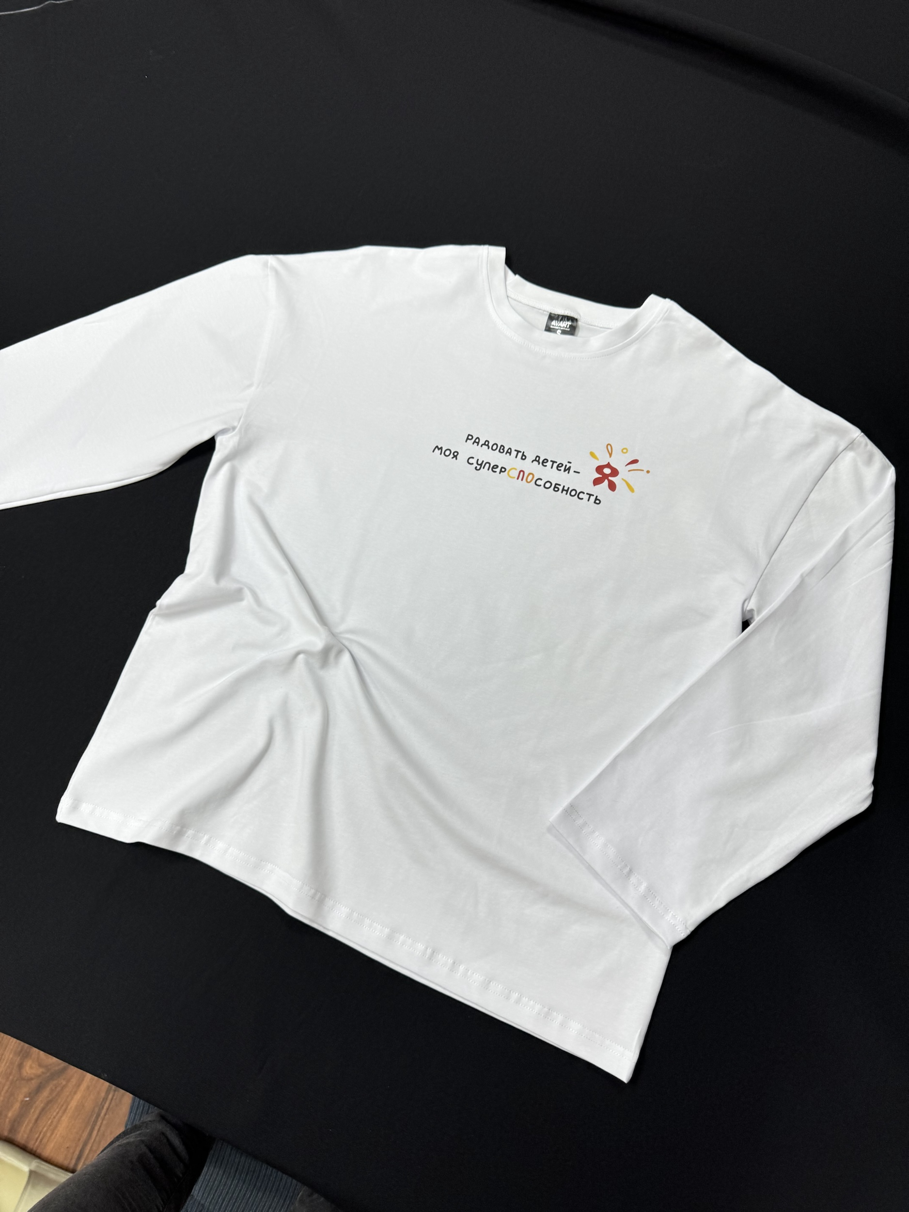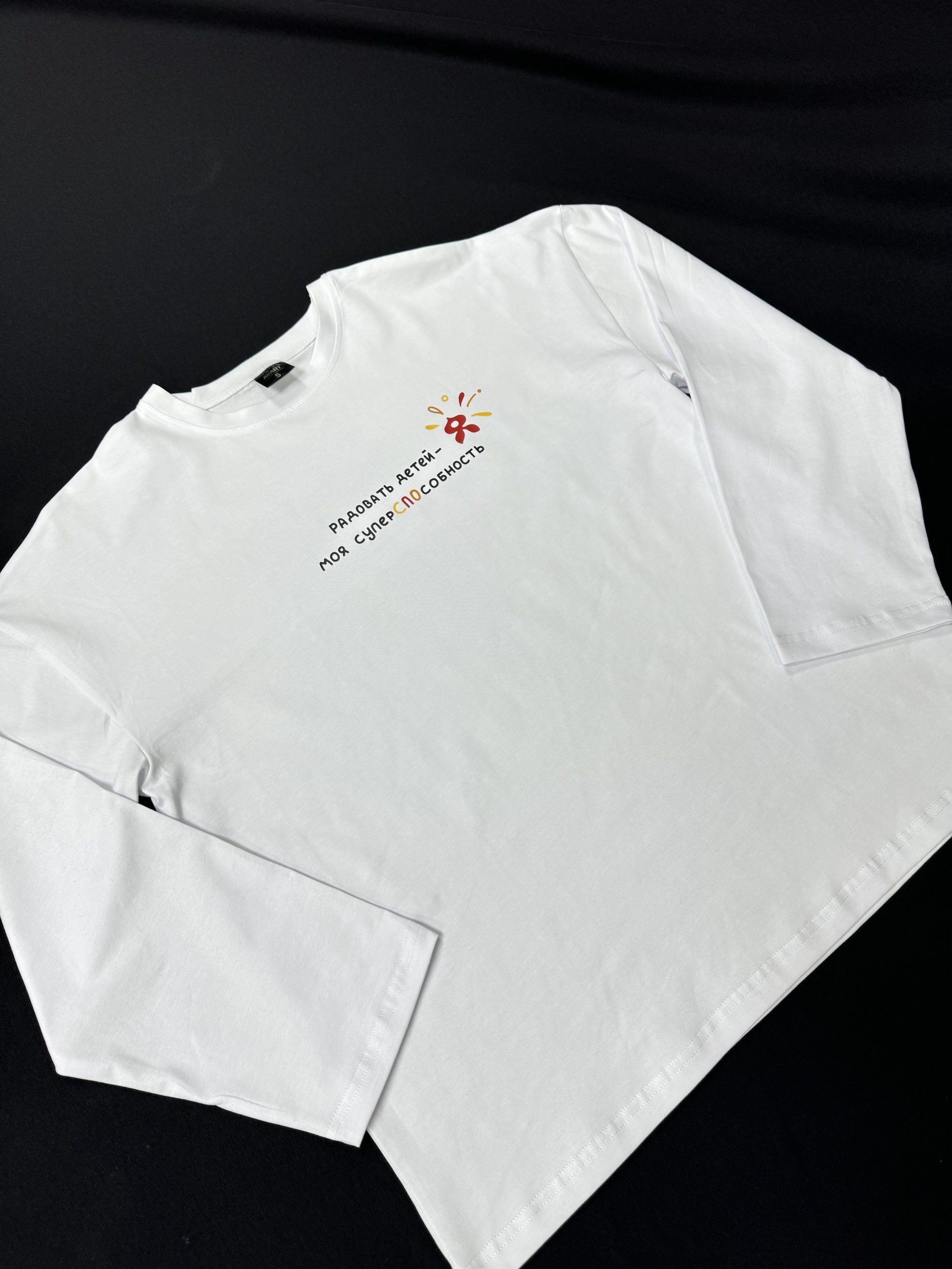 Белый лонгслив оверсайз с принтом «Радовать детей – моя суперСПОсобность». Надпись оформлена в минималистичном стиле с акцентом на слово «СПО», выделенное цветом, что делает отсылку к студенческим педагогическим отрядам. Рядом изображен символ направления. Принт подчеркивает идею педагогического призвания – приносить радость детям и вдохновлять их.