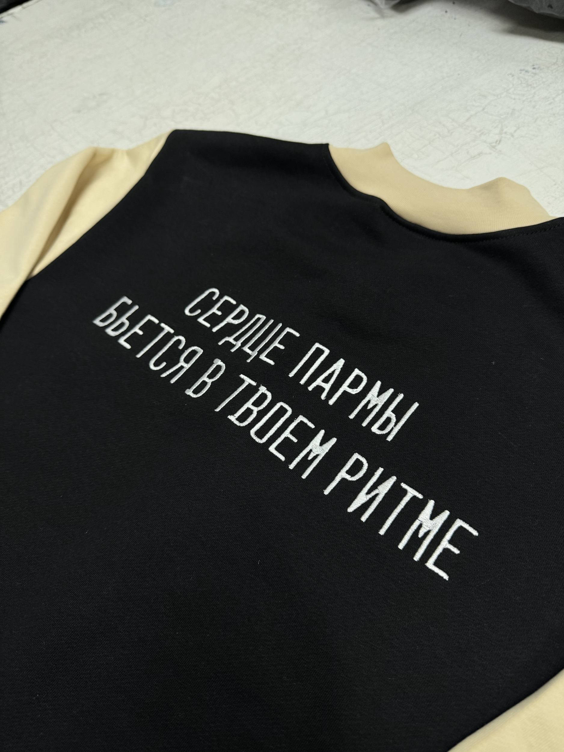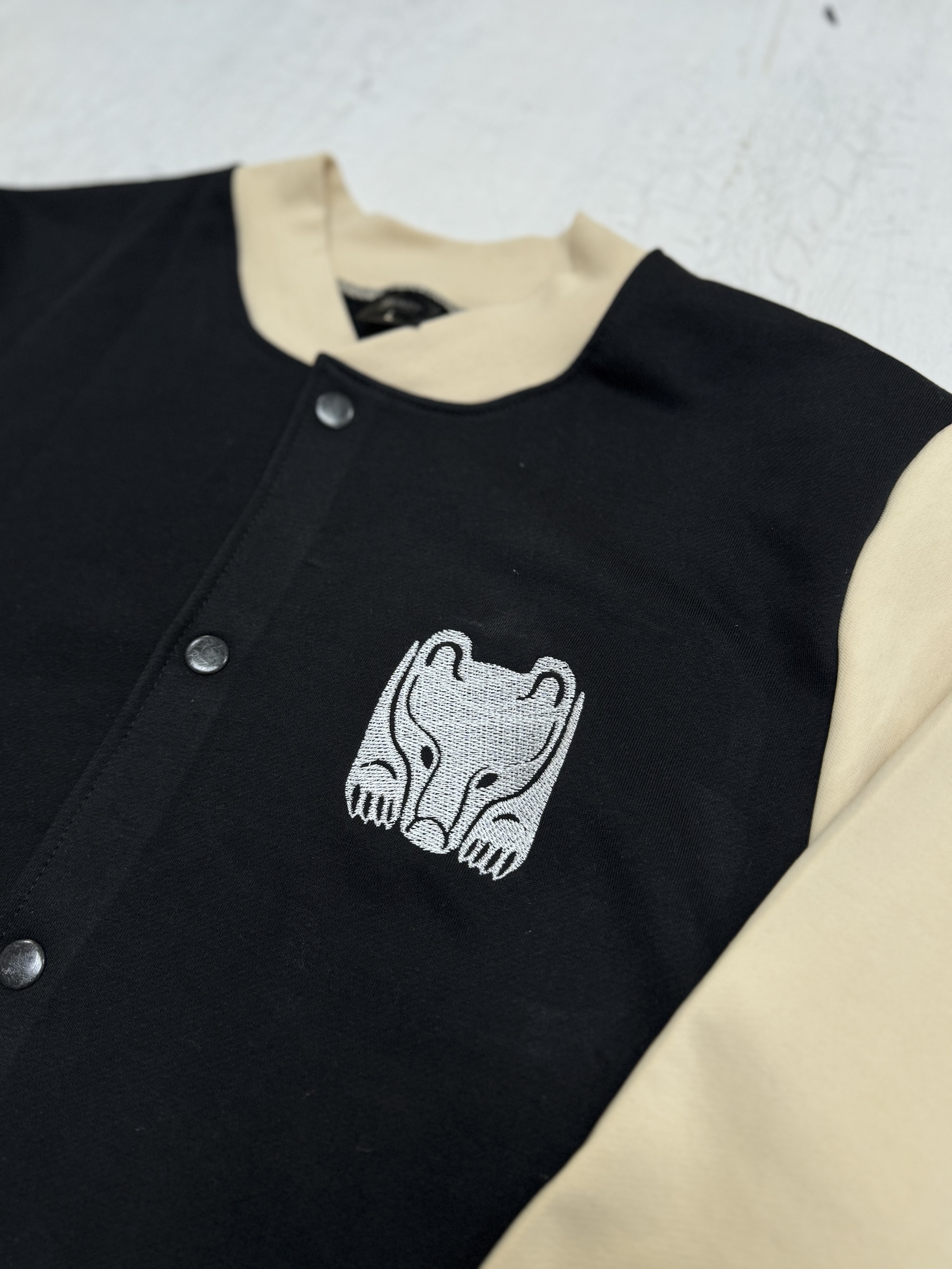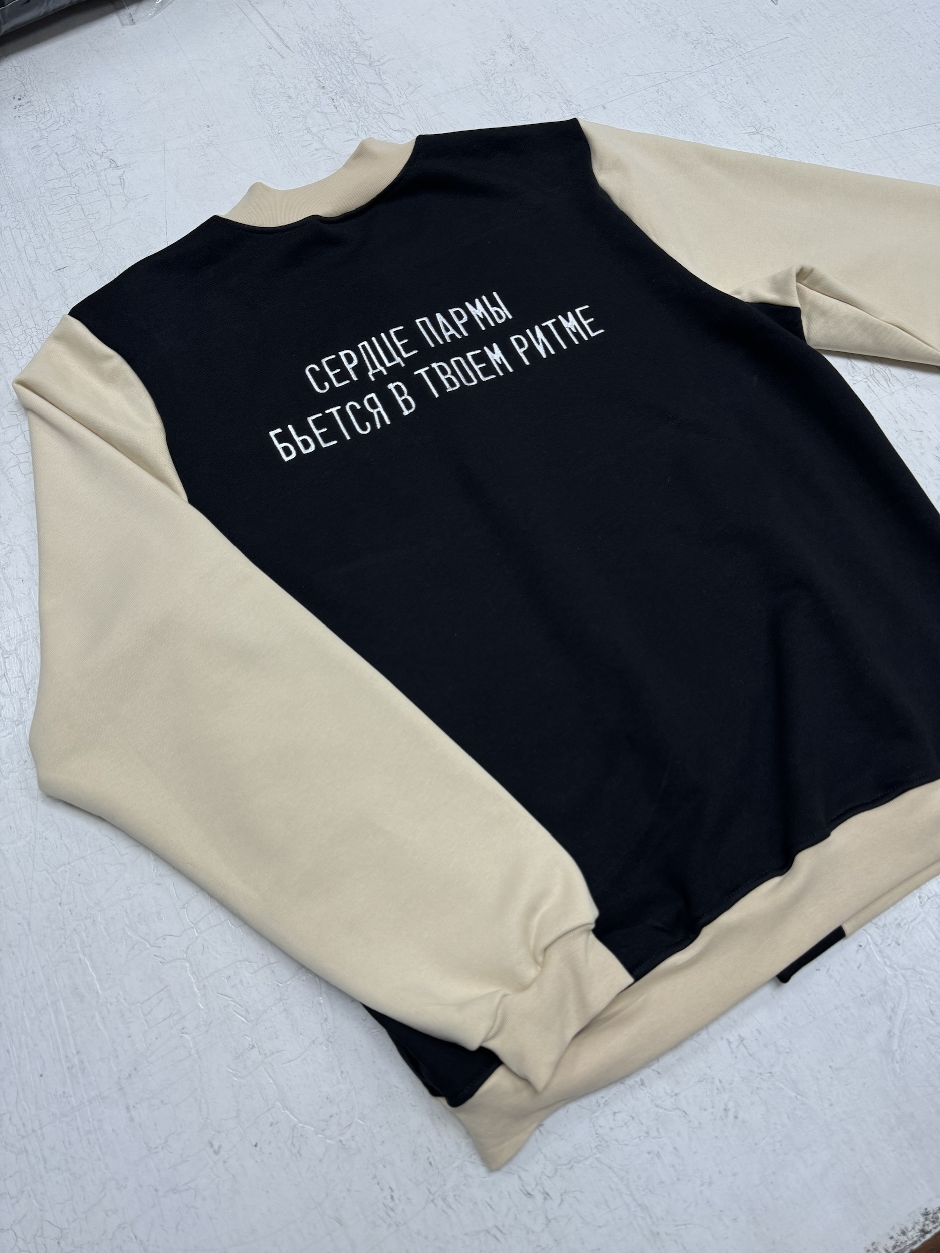 Создан новый бомбер в классическом сочетании черного и бежевого цветов. На груди аккуратная вышивка с изображением медведя, символизирующая силу и уверенность. Спина дополнена фразой «Сердце Пармы бьется в твоем ритме», что добавляет изделию глубокий смысл и эмоциональную связь.