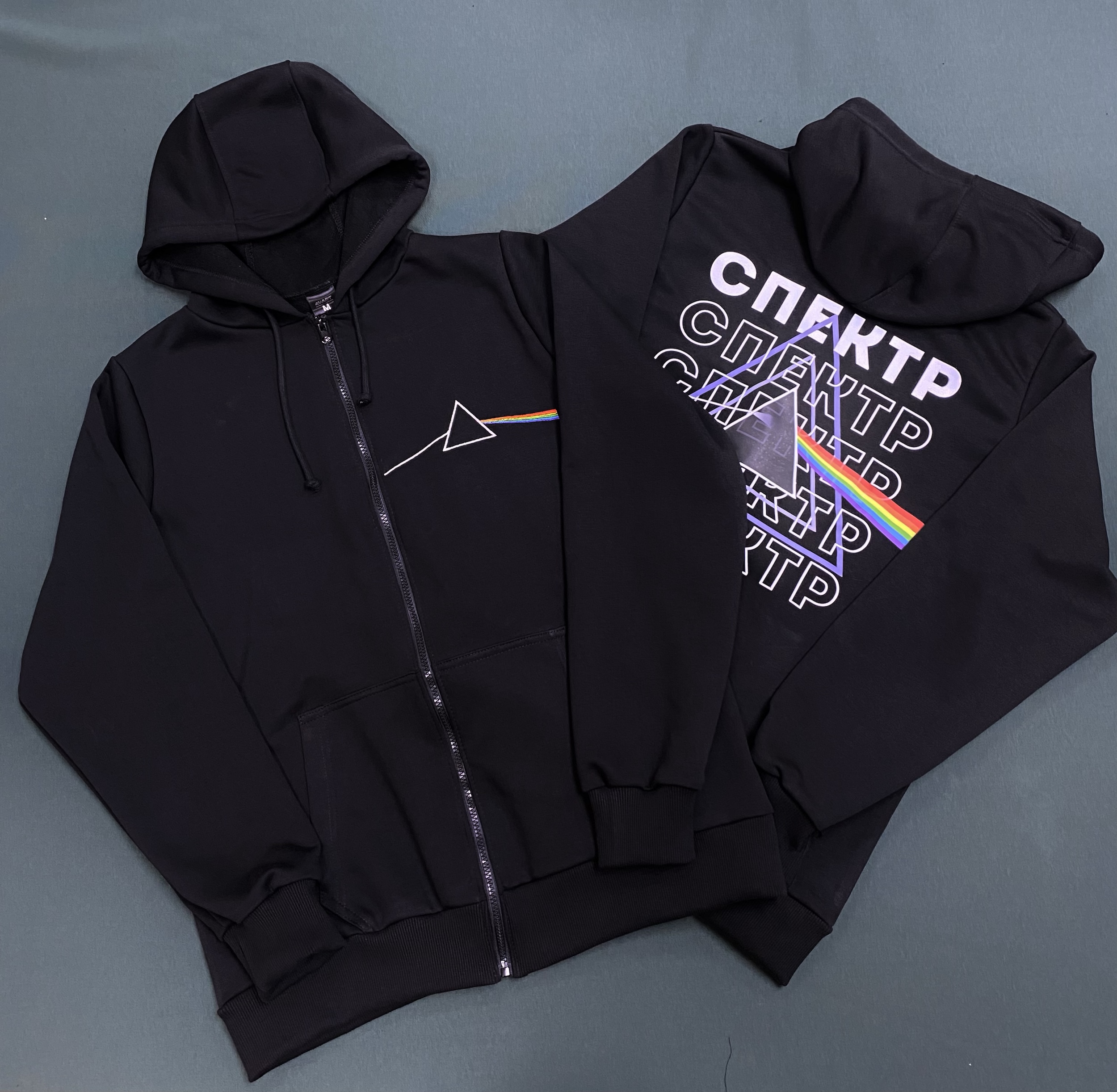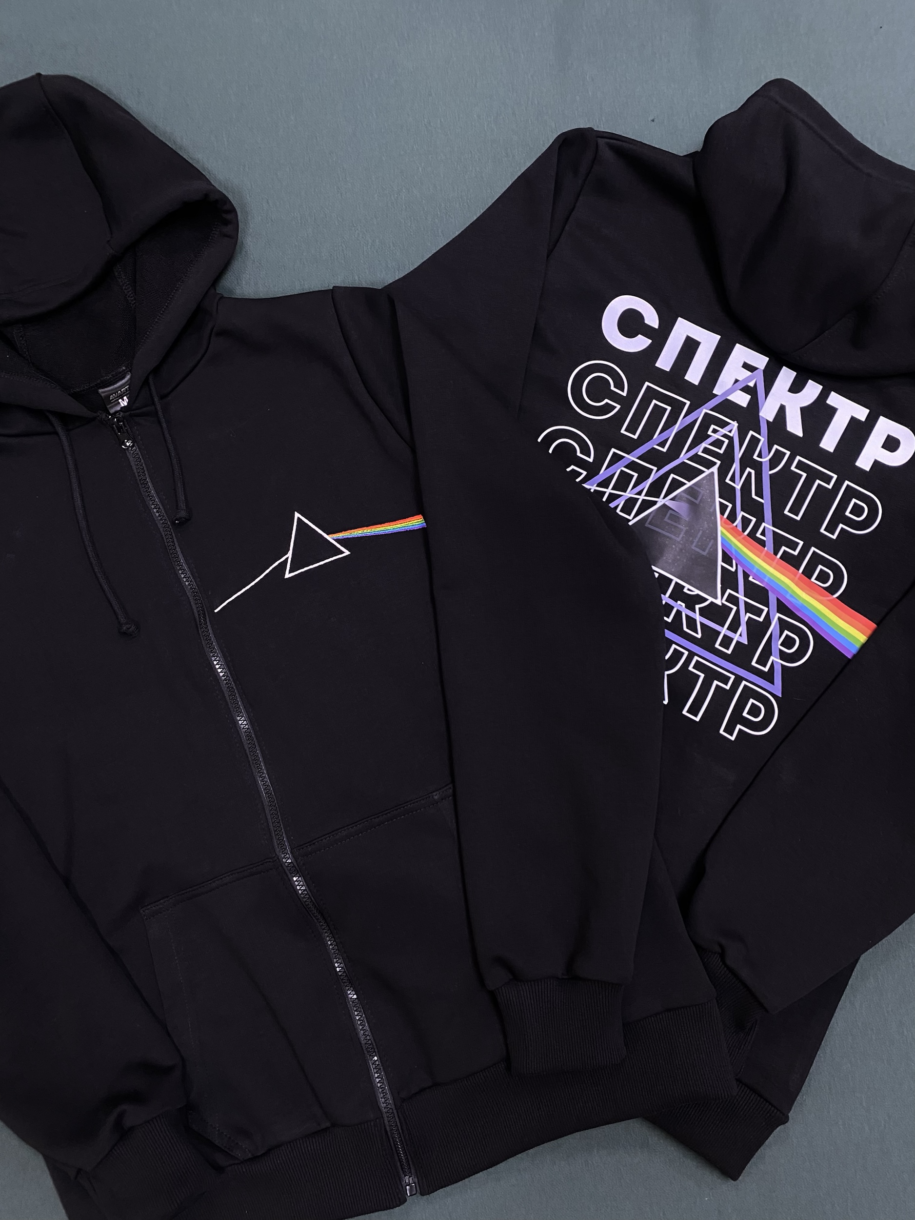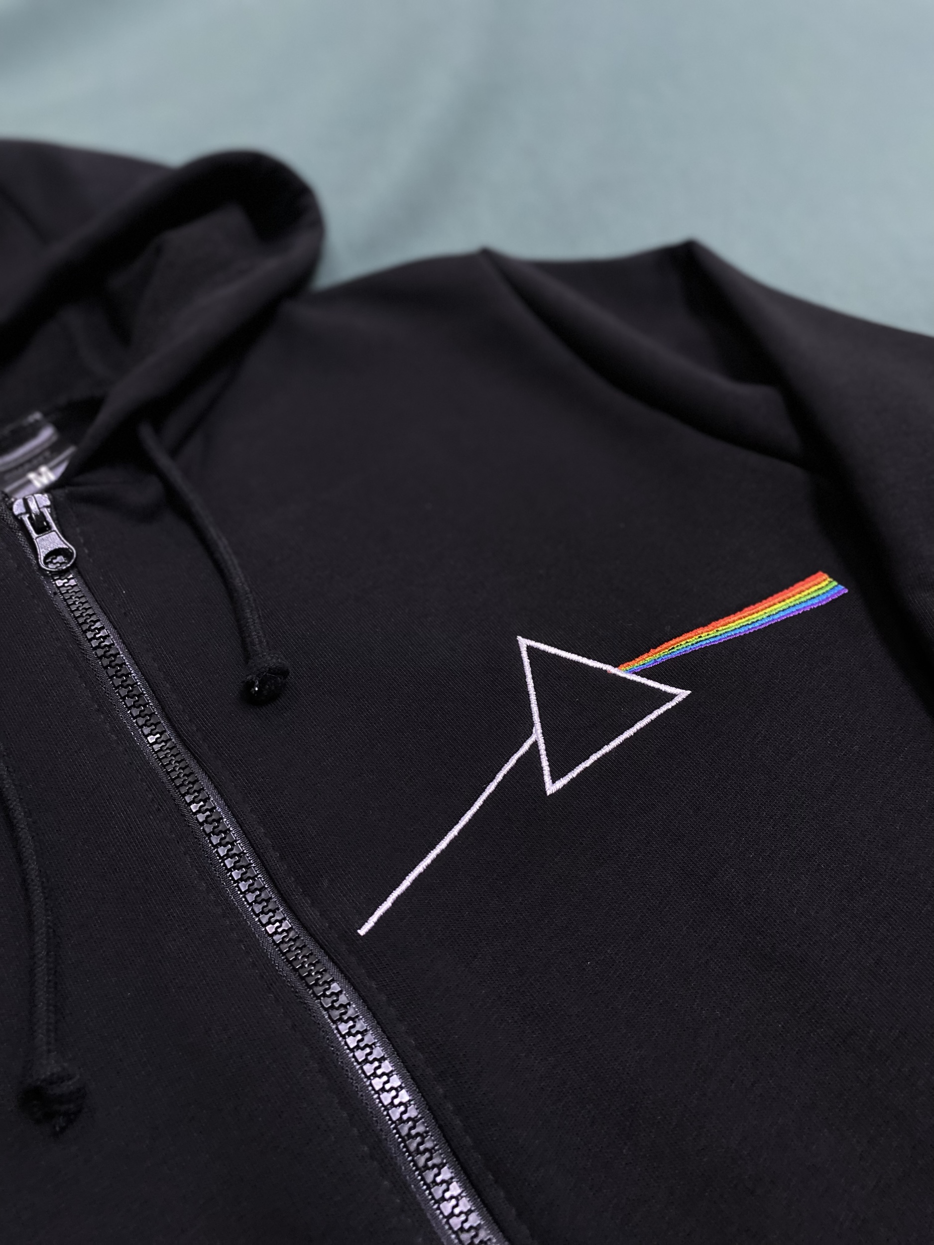 Чёрное худи на молнии с вышивкой в стиле культового альбома The Dark Side of the Moon от Pink Floyd. Лаконичный треугольный контур с преломляющимся радужным лучом — минимализм, который говорит сам за себя.