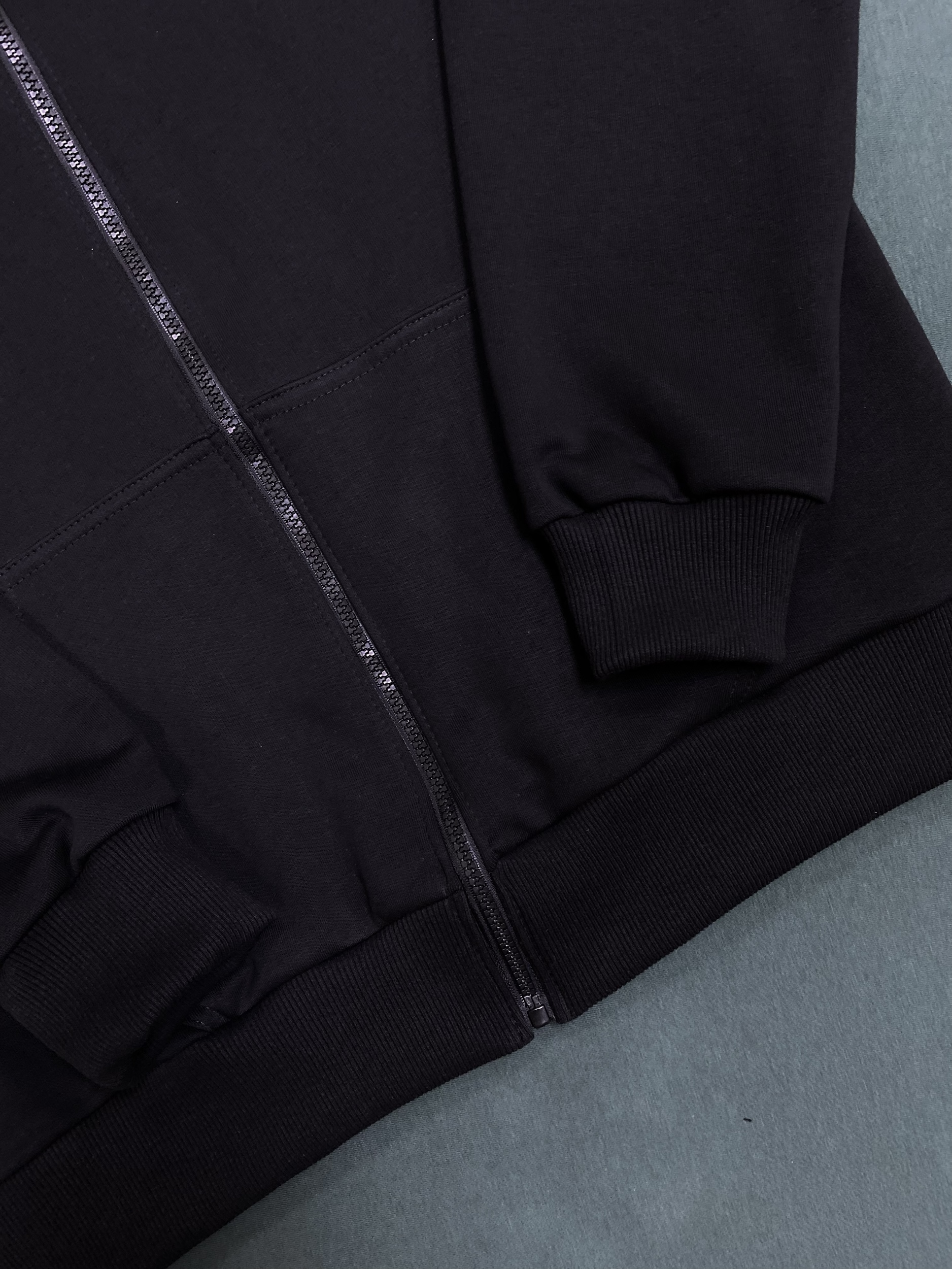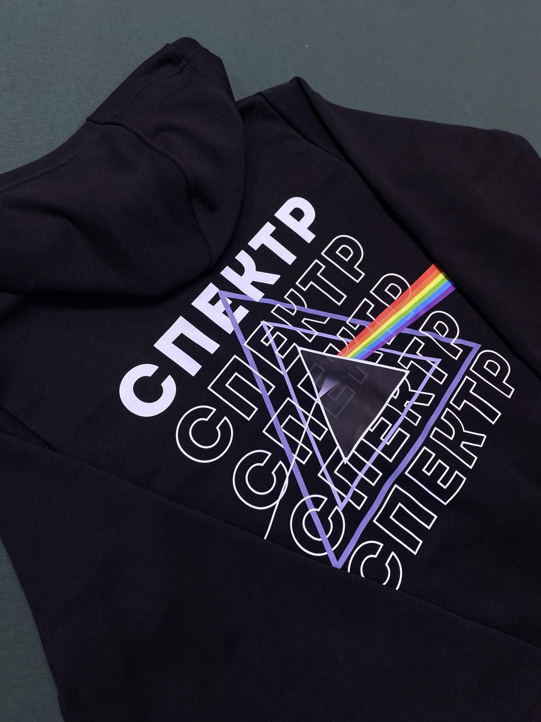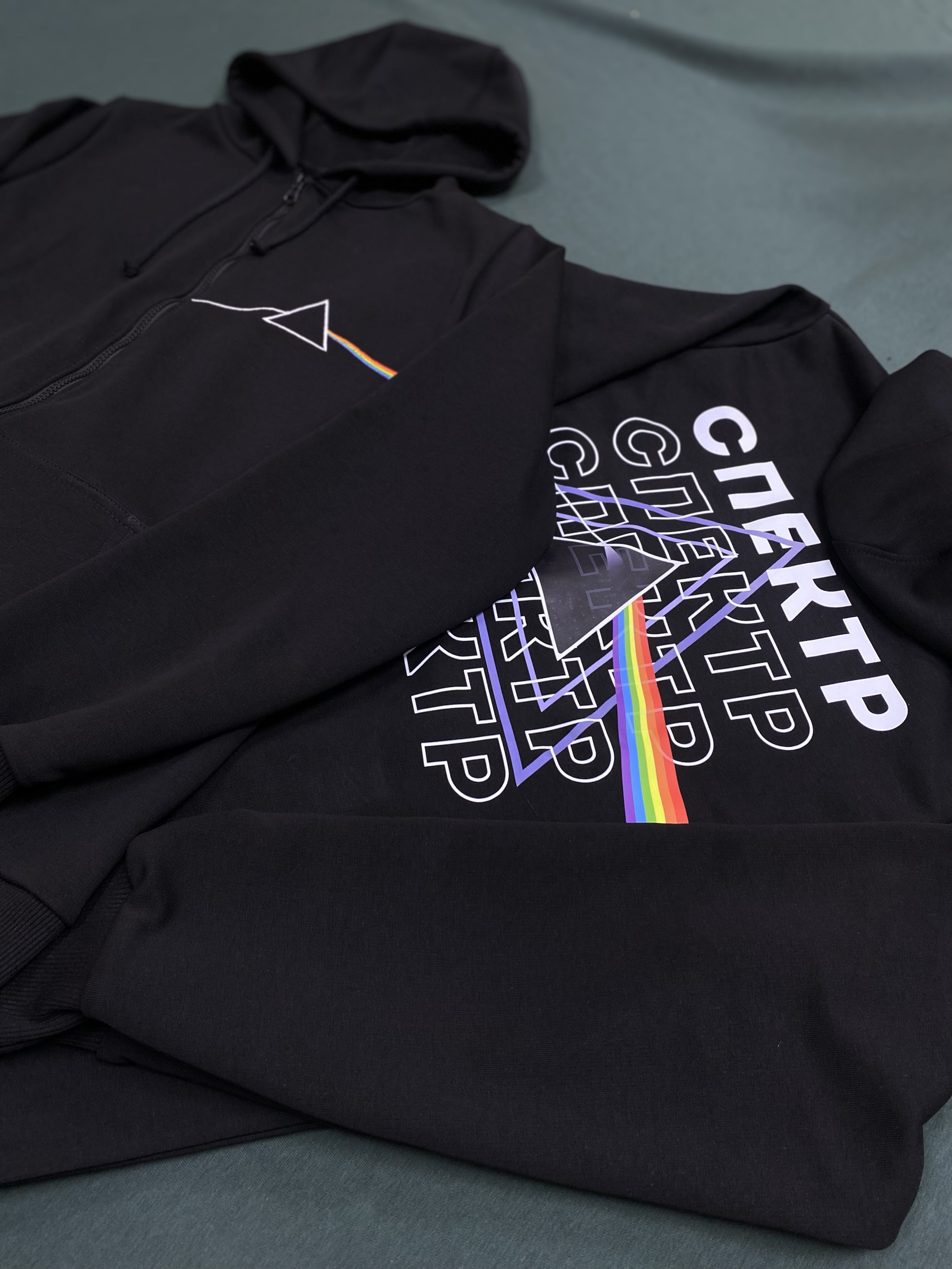 Чёрное худи на молнии с вышивкой в стиле культового альбома The Dark Side of the Moon от Pink Floyd. Лаконичный треугольный контур с преломляющимся радужным лучом — минимализм, который говорит сам за себя.